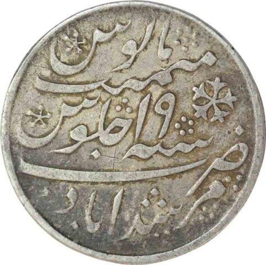 | Full Description: Bengal Presidency, Murshidabad, Silver Rupee, 19 RY, Big flan, Straight milling, in the name of Shah Alam II, Obv: "saya-e-fazle elah" couplet, Rev: sana julus zarb, 12.3 g, 28.72 mm, about very fine, Scarce. | ||||