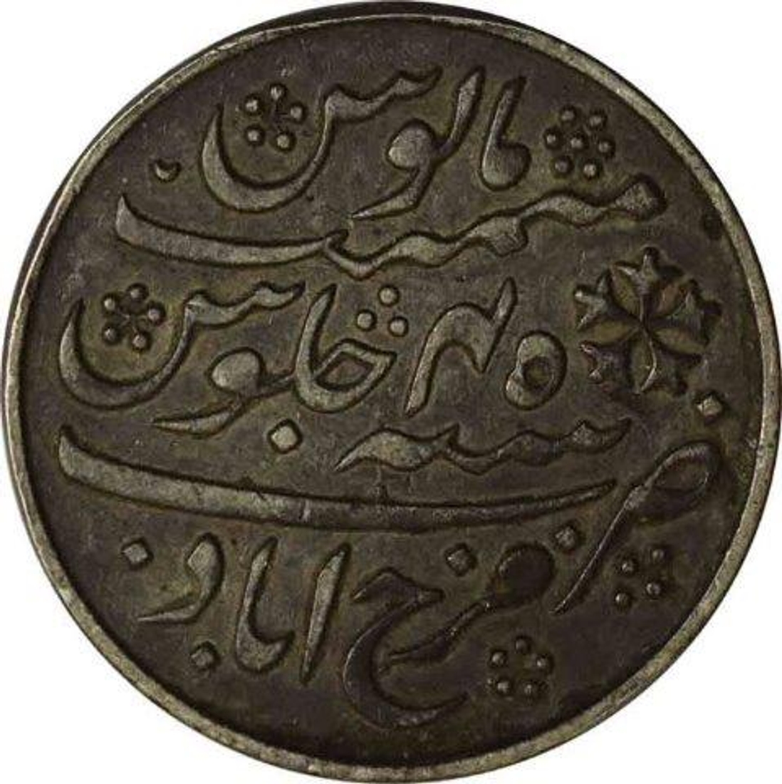 | Full Description: Bengal Presidency, Farukhabad, Silver Rupees, In the name of Shah Alam II, 45 RY, Obv: "saya-e-fazle elah" couplet & cresent mark, Rev: sana julus zarb & floral mark, (KM # 77), 11.6g, 26.40mm, about very fine. | ||||