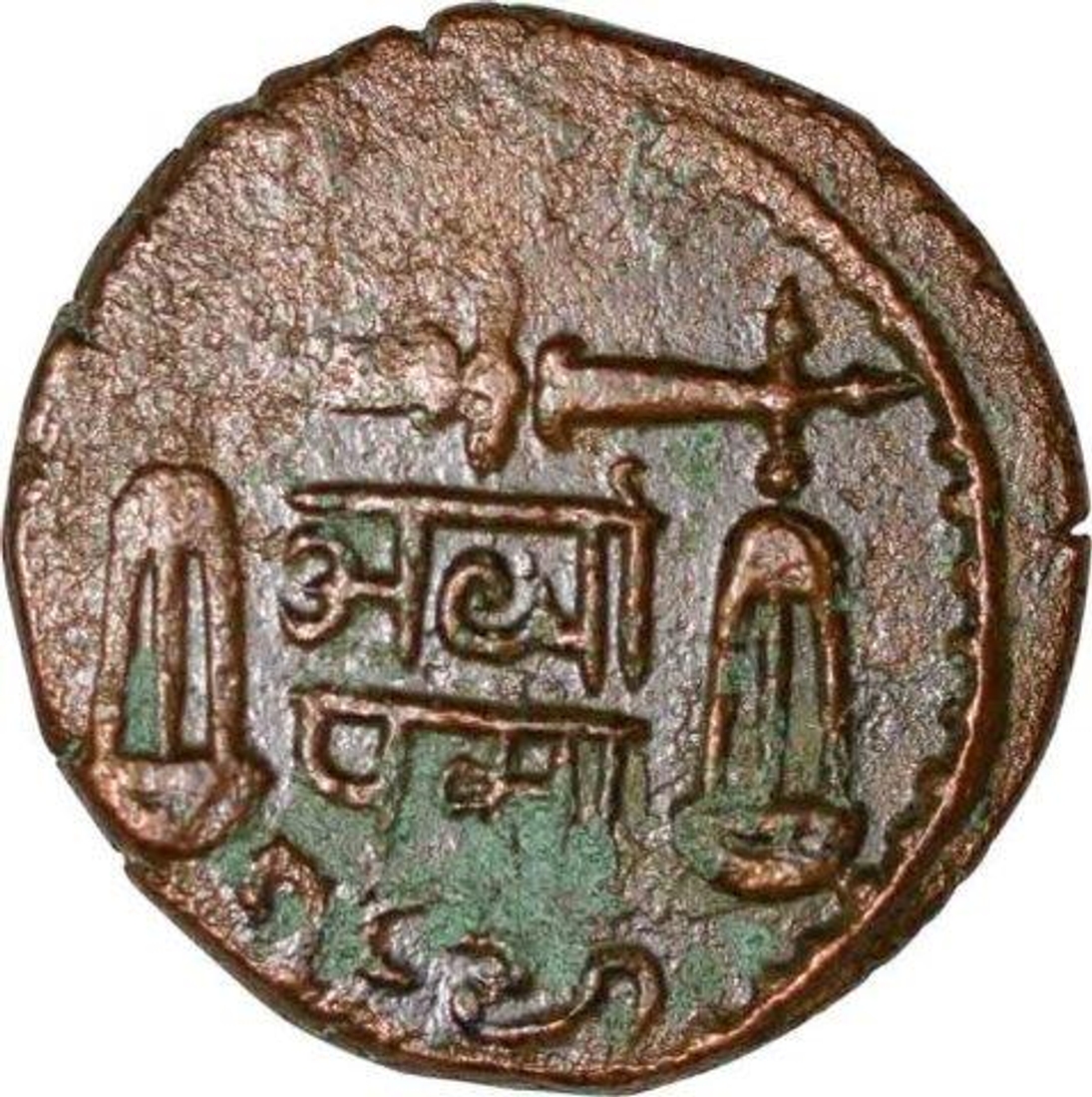 | Full Description: Bombay Presidency, Copper 1/2 Pice, Konkan Issue, Nagari “Ardha Paisa”, Obv: U.E.I. Co bale mark, date AD 1821, Rev: scales, value in hindi, date in devanagari script, (KM # 225), 3.59g, 17.88mm, about extremely fine, Rare. | ||||