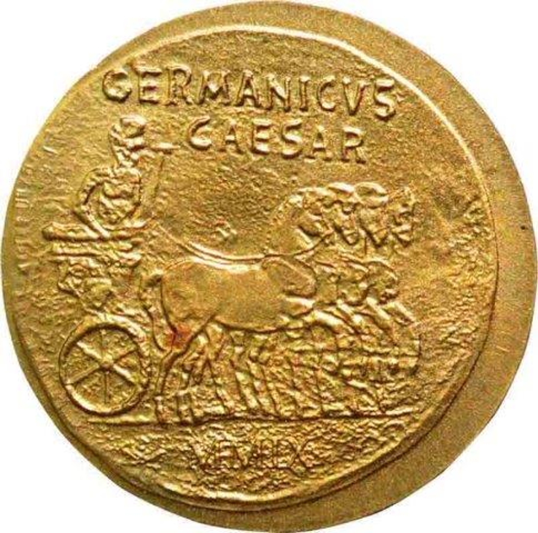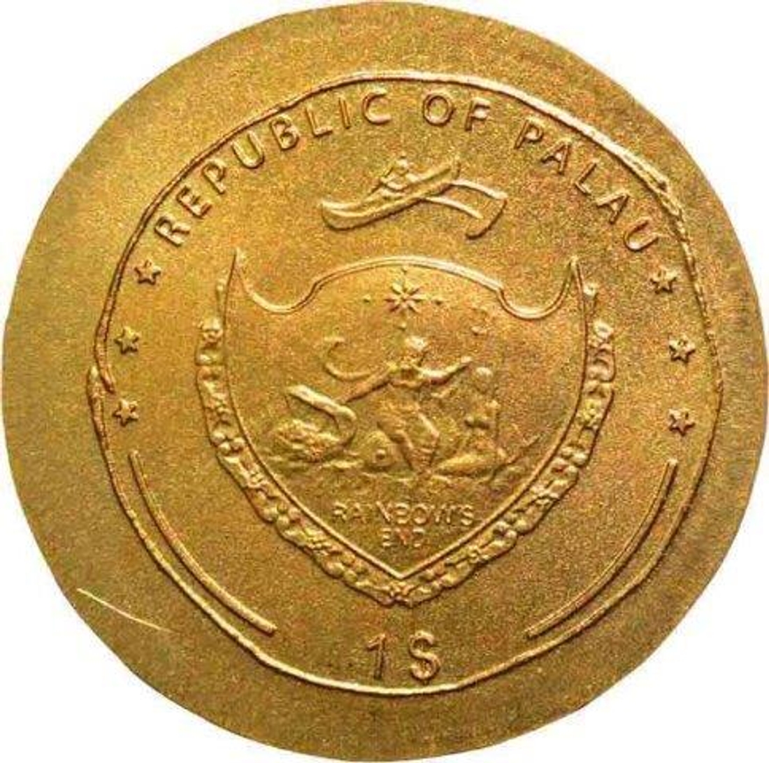 | Full Description: Republic of Palau, Proof Gold 1 Dollar, Obv: on top "republic of palau", denomination, in center coat of arms of republic of palau,"rainbows end"in heart shaped symbol, Rev: roman empire riding the chariot, on top the inscription" germanius caesar", 0.5 g, 11.8 mm, UNC. | ||||