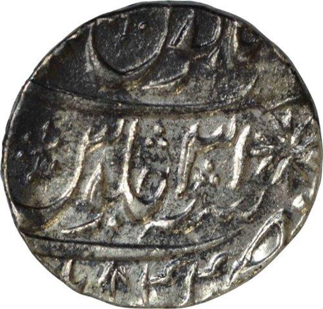 | Full Description: Ravishnagar Sagar, Silver Rupee, in the name of Shah Alam II, AH 1202/ 31 RY, Obv: saya-e-fazle elah couplet, Rev: sana julus zarb at bottom, 11.15gm, 22.17mm, Mint Mark Unlisted, about very fine. | ||||