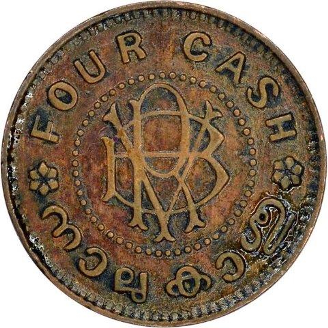 Travancore, Rama Varma VI (AD 1885-1924), Copper 4 Cash, Obv: RV monogram & value in english & malaylam, Rev: sankha (conch shell) in sprays, 1.94g, 17.47mm about very fine.