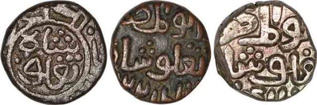 Delhi Sultanat, Tughluq Dynasty, Ghiyath-ud-din Tughluq, Billon 4 Gani (2) & Copper 2 Gani, Set of three different varieties, 3.20g, 3.35g, 3.70g, 14.80mm, 14.74mm, 14.60mm, (G&G# D311 & D312), about very fine.