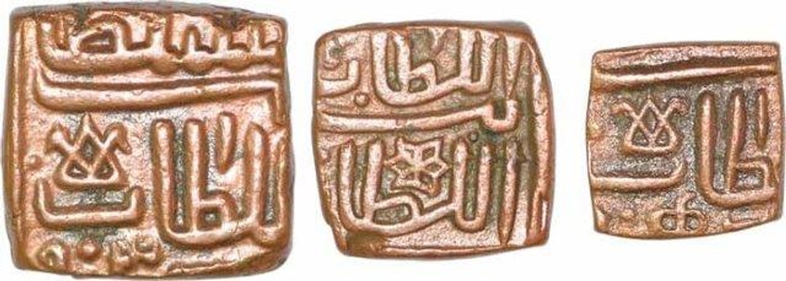 | Full Description: Malwa Sultanate, Ghiyath Shah (AH873-906/1469-1500AD), Copper Fulus (3), Fulus, 1/2 Fulus & 1/4 Fulus, Obv: ghiyath shah khalji bin mahmud shah, Rev: al-sultan bin al-sultan, 8.71g, 4.45g, 2.10g, 17.42x16.69mm, 14.37x14.40mm, 11.83x11.82mm, (G&G# M87, M88, M92), about extremely fine. | ||||