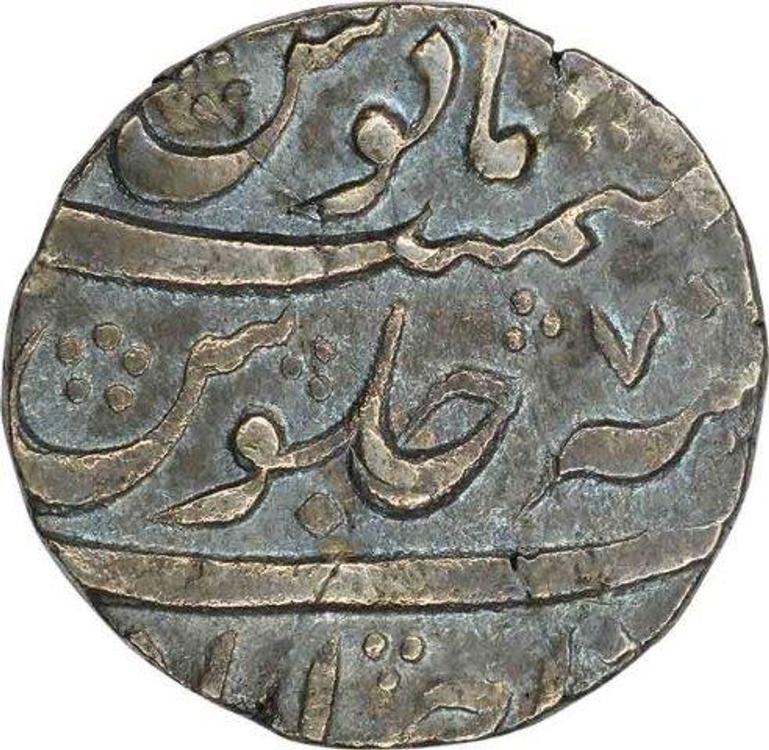 | Full Description: Aurangzeb Alamgir, Ahmadabad, Silver Rupee, AH 1074/7 RY, Obv: "badr munir" couplet, Rev: manus memanat sanah julus zarb ahmadabad, 11.50 g, 21.20 mm, (KM # 300.2), about very fine. | ||||