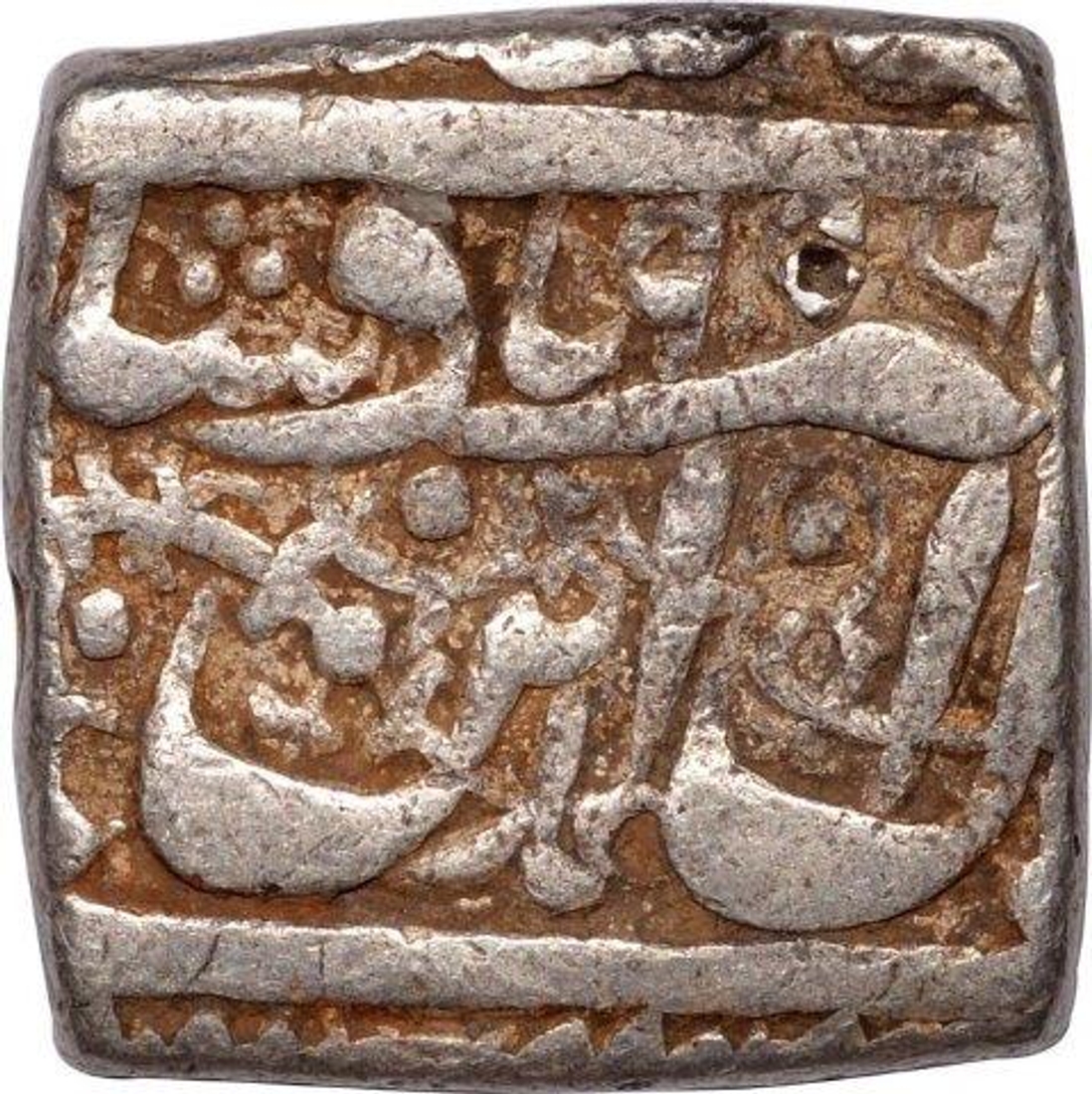 Akbar, Mint out of flan, Silver Square Rupee, AH 996, Obv: kalima shahada, Rev: ruler name with titles, 11.35g, 17.82 x 17.86mm, about fine.