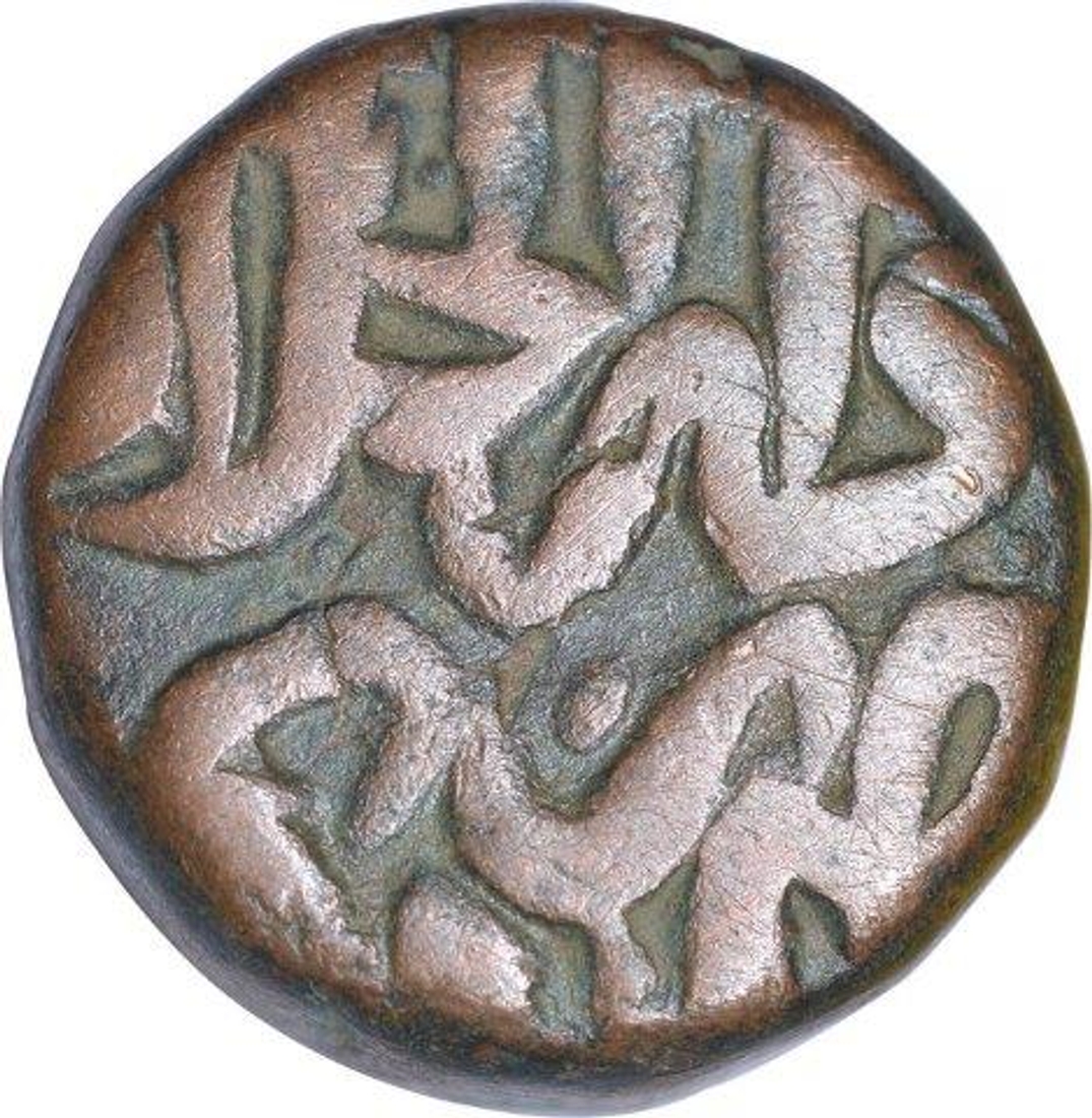 Akbar, Agra Dar ul Khilafat Mint, Copper Dam, Fi Tarikh type, without horizontal dividing line, semi-Tughra style epithet on reverse, 20.80g, 22.04mm, about very fine.