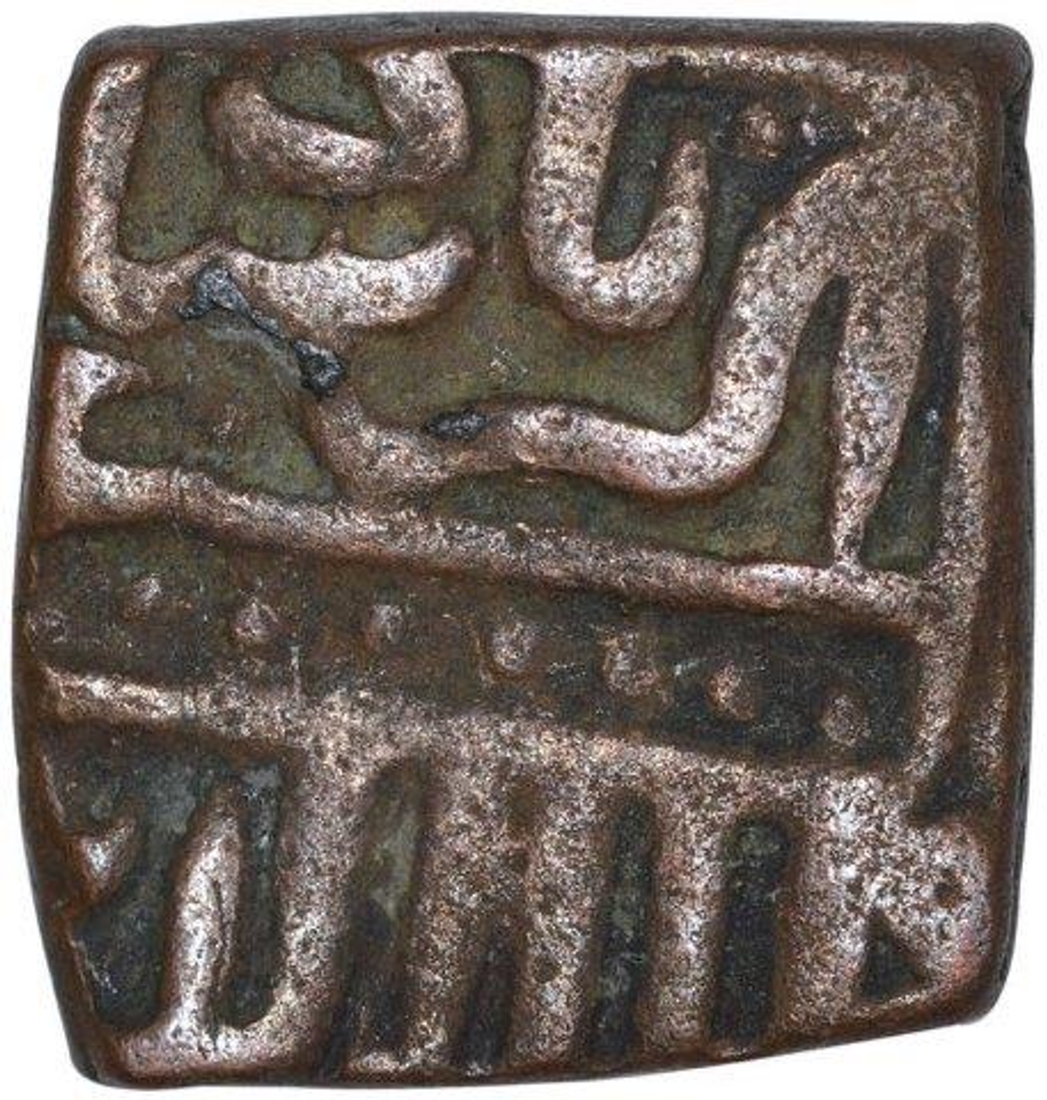 Akbar, Copper Square Tanka, Obv: kalima shahada, Rev: akbar badshah ghazi, 6.80g, 15.50g x 14.80mm, about very fine.