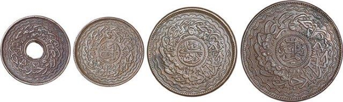 Hyderabad State, Mir Usman Ali Khan (AH 1329-1367/1911-1948 AD), 1 Pai, 2 Pai (2), 1/2 Anna, Set of Four different Varieties, Milled Coinage, 1.95g, 1.15g, 3.90g, 11.75g, 16.06mm, 16.03mm, 20.51mm, 31.30mm, about extremely fine.