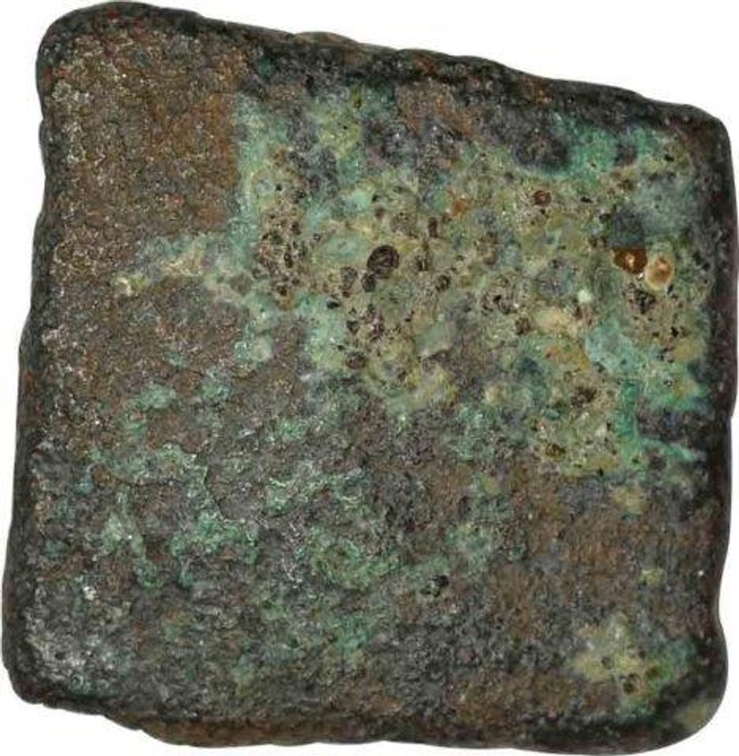 | Full Description: Bhadra & Mitra Dynasty, Kingdom of Vidarbha, Krishnamitra (100 BC), Copper Unit, Obv: ujjaini symbol top, river below with fishes, brahmi legend 'ka..namitasa in center in horizontal, Rev: uniface, 2.95g, 13.43 X 13.46 mm, about fine,Rare. | ||||