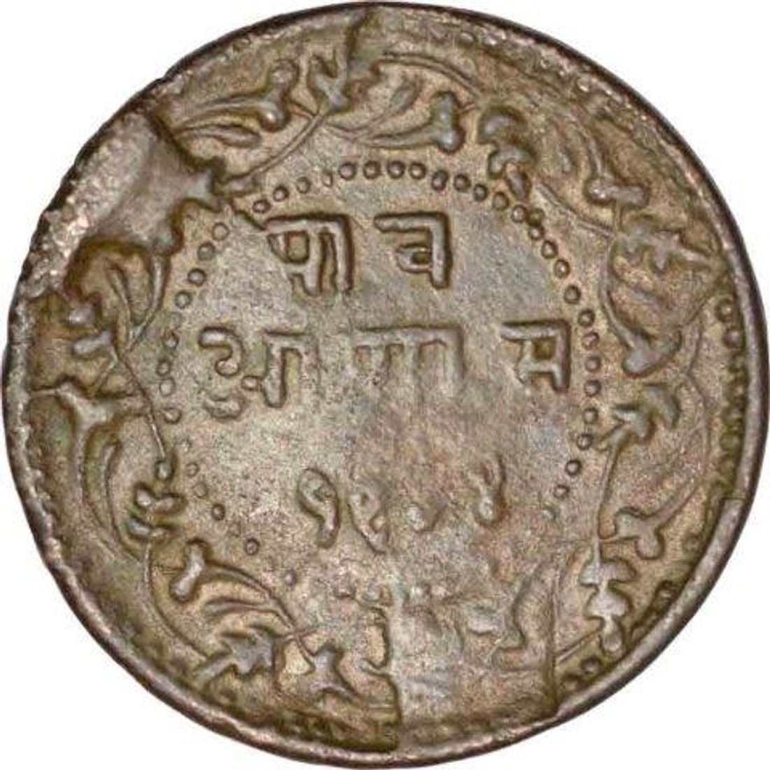 Indore, Shivaji Rao, Copper 1/4 Anna, Obv: bull reclining left, ruler’s name spelled “sayaji rao”, die crack error on both, Rev: more extra metal, 6.51g, 26.33mm, about fine.