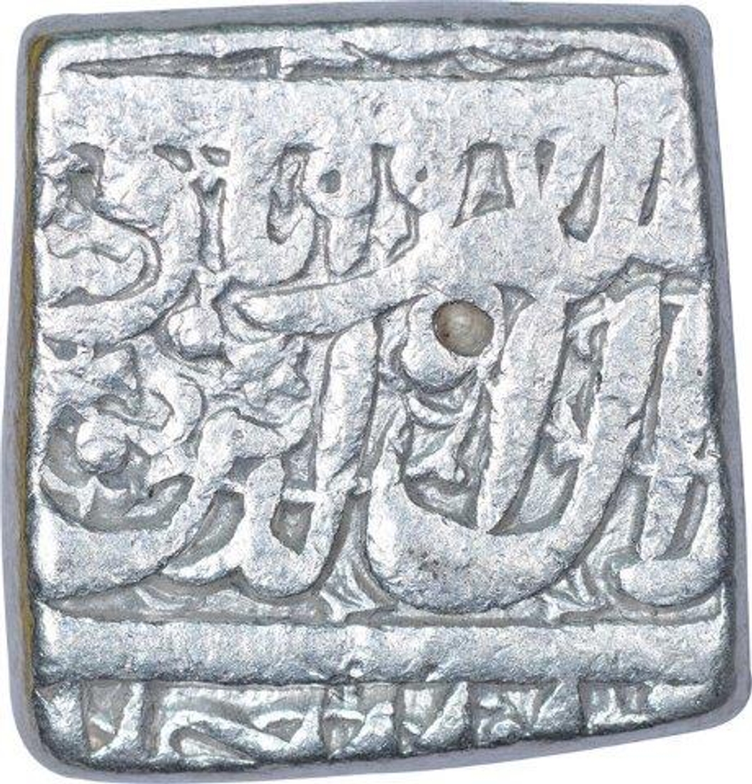 Akbar, Square Silver Rupee, AH 999, Obv: kalima shahada, Rev: jalal ud-din muhammad akbar badshah ghazi, 11.25g, 17.73 X 17.0mm, about very fine.
