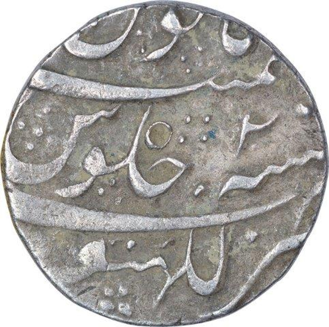 Shah Alam Bahadur (1707-1712), Lakhnau Mint, Silver Rupee, 2 RY, Obv: sikka mubarak badshah ghazi, Rev: sana julus zarb at bottom, 11.55g, 23.35mm, (KM # 347.14), about very fine.