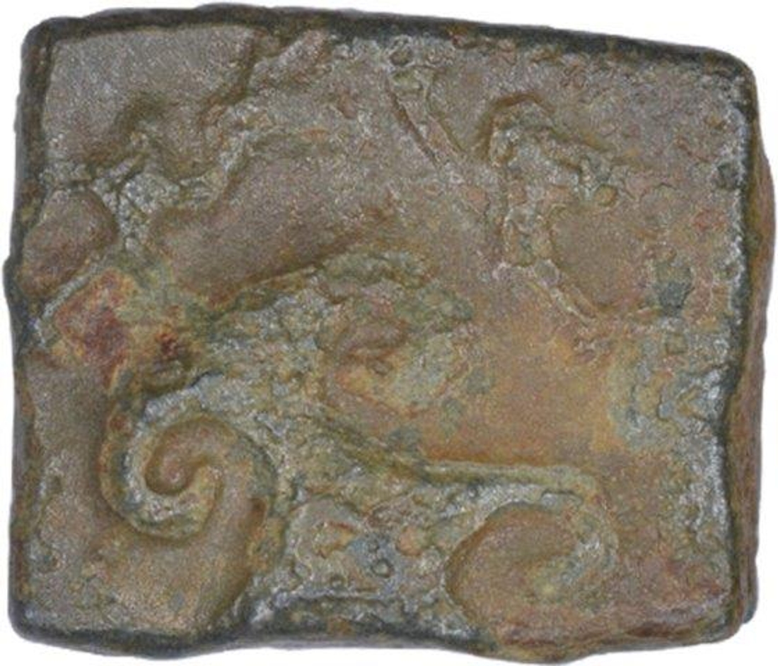 Kingdom of Vidarbha (Paunar) (100 BC), Copper Unit, Obv: bull walking to right, ujjaini symbol above, Rev: srivatsa within decorative square, in completely natural condition with green patina, 1.05g, 9.70 x 8.35mm, about very fine.