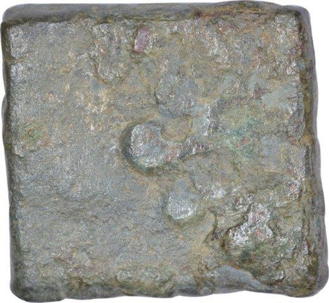 Kingdom of Vidarbha (100 BC), Copper Unit, Obv: standing godess gajalaxmi with deity standing on a stand, gaja's the elephant at both the sides pouring sacred water, Rev: armed wheel, 1.90g, 11.42 x 10.71mm, about very fine.