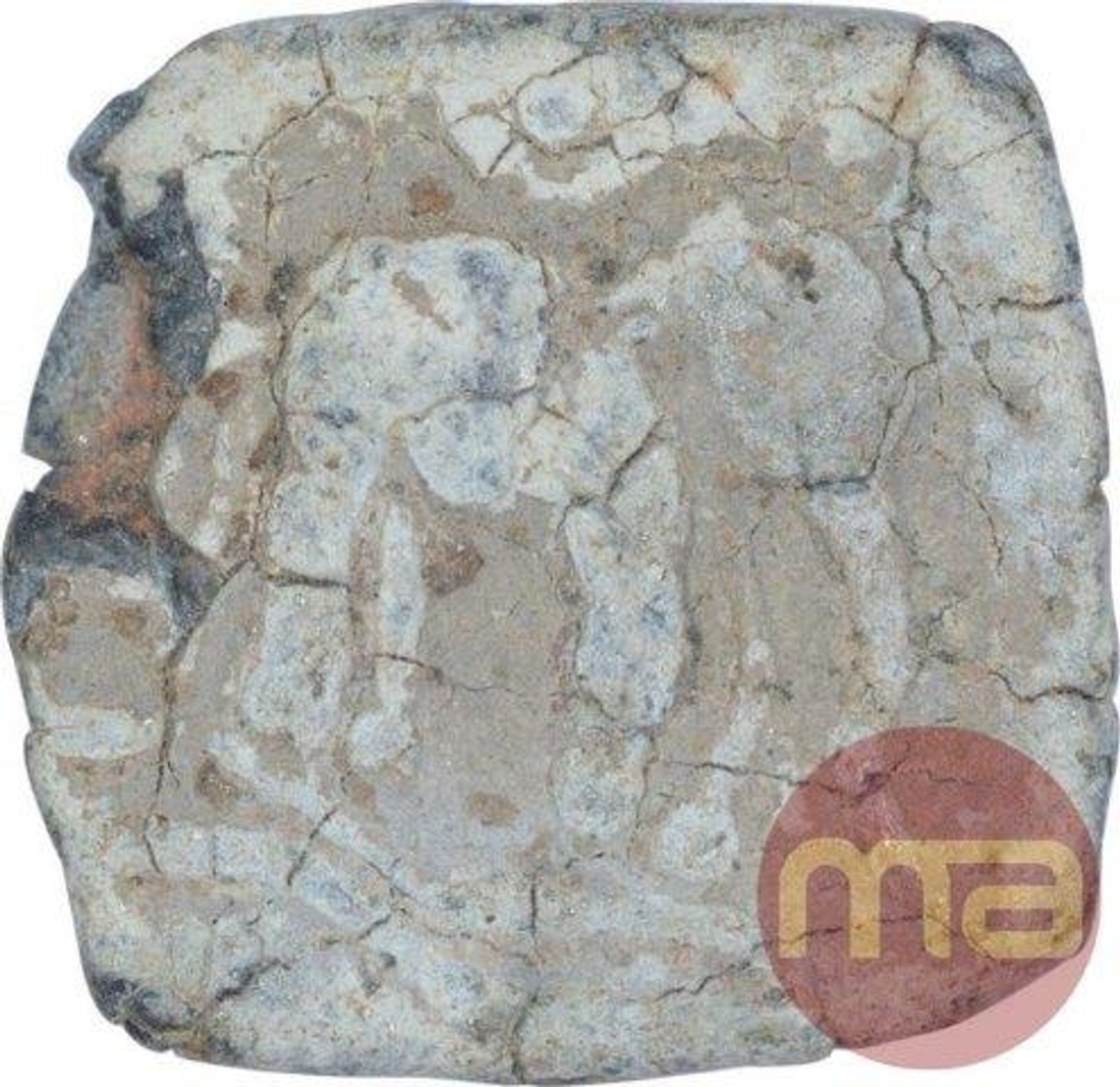 Satavahana Dynasty, Vidarbha Region, Satakarni I (100 BC), Lead square Unit, Obv: elephant right, Rev: indradvaja, svastika, 1.65g, 12.35 x 12.08mm, about fine.