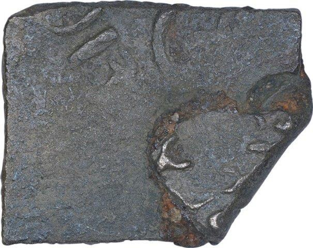 Kingdom of Vidarbha, Dharmabhadra (100 BC), Copper Unit, In complete natural condition with green patina, Obv: on top, legend in bold brahmi "dhamabhadasa", below it, on left, head of a bull to right with a svastika symbol below it and, on right of it, a large circle with a noose-like device within it, Rev: part of a design comprising of a svastika placed in the center with four rectangles each having a nandipada inside it arranged in cardinal directions like cross, a taurine is seen in each of the diagonal centres, 3.55g, 17.75 x 13.99mm, ( Nidhi Vol. I, Mitra and Bhadra Coins from Vidarbha, Ajay Mitra Shastri & Chandrashekhar Gupta, Fig. 11 ) about fine.
