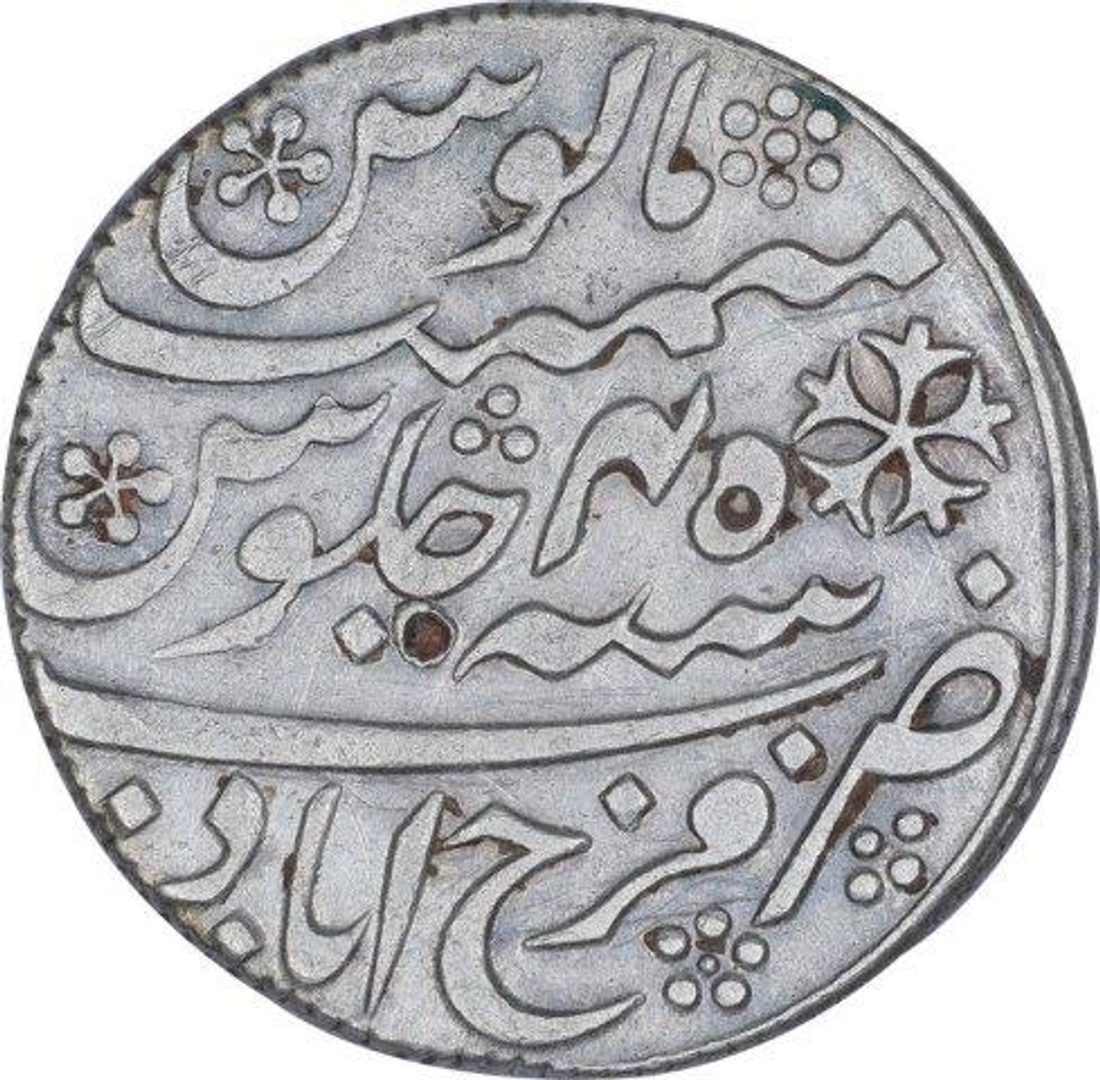 | Full Description: Bengal Presidency, Farrukhabad Mint, Silver Rupee, 45 RY, Banaras Issue, Vertical Milling, In the name of Shah Alam II, Obv: "saya-e-fazle elah" couplet & inverted "v", Rev: sana julus and zarb at bottom & microdot, 11.54g, 26.3mm, (KM # 70), about very fine. | ||||