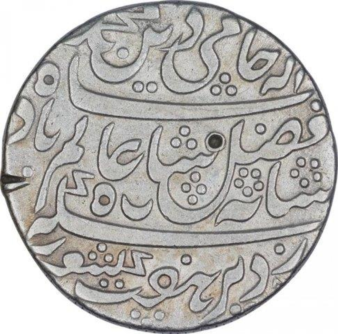 | Full Description: Bengal Presidency, Farrukhabad Mint, Silver Rupee, AH 1212/45 RY, In the name of Shah Alam II, Obv: "saya-e-fazle elah" couplet, fish and sun marks, Rev: sana julus zarb on top, and daroga mint mark, 11.25g, 24.6mm, (KM # 40.1), about very fine. | ||||
