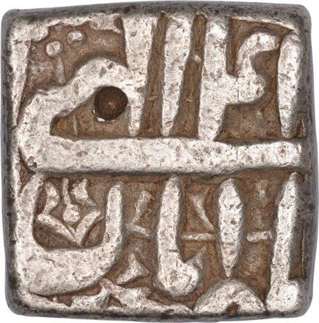 Akbar, Delhi Mint, Silver Square Rupee, Ilahi 41, Month Aban, Obv: jalla jalalahu...& mint name, one test mark on rev, 11.31g, 15.49 x 15.27mm, (KM # 88.2), about very fine, Rare.