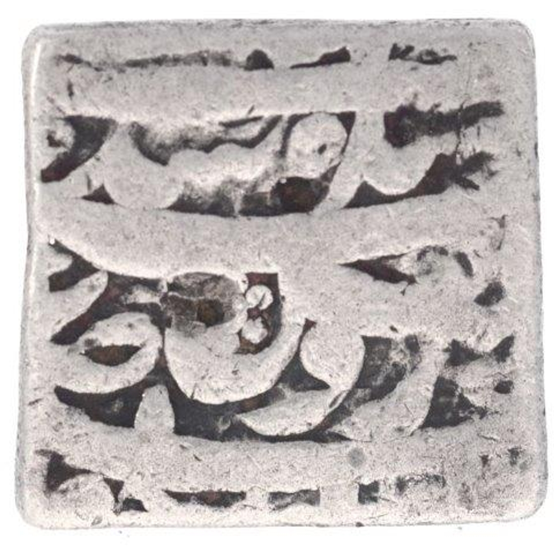 Akbar, Bangala Mint, Silver Square Rupee, Obv: kalima shahada, Rev: "kaab-e-roushan" couplet, 10.91g, 19.14 X 18.26mm, (KM # 86.1), about very fine, Rare.