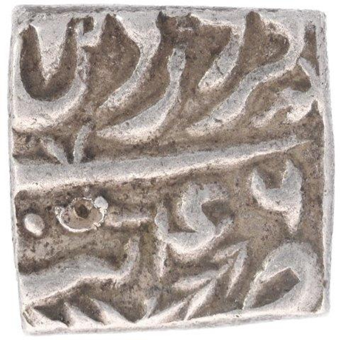 Akbar, Tatta Mint, Silver Square Rupee, Elahi 46, Month Farwardin, Obv: jalla jalalahu allahu akbar, Rev: elahi month and zarb, 11.35g, 15.35 x 15.64 mm, (KM # 88.7), about very fine.