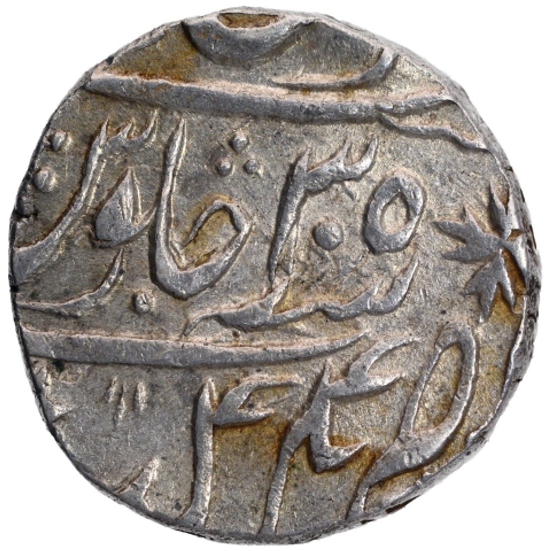 | Full Description: Maratha Confederacy, Balanagar Gadha (Mandla) Mint, Silver Rupee, 35 RY, “Saya-e-fazle Elah” Couplet, In the name of Shah Alam II, Obv: Persian legend "Sikka zad bar haft kishwar Saya-e fazle Elah, Hami dine Muhammad shah Alam Badshah", trident mintmark, Rev: Persian legend "sana 35 julus & "zarb Balanagar Gadha" partly visible at the bottom, 11.3g, 18.98mm, (KM # 288), AU-UNC. | ||||