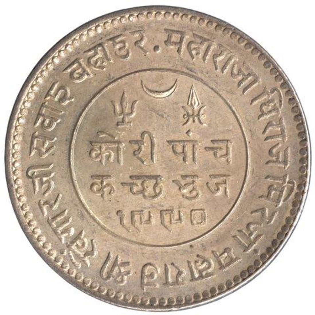 | Full Description: Kutch, Khengarji III, Bhuj, Silver 5 Kori, in the name of King George V, 1933 AD, Obv: Qaisar-e- Hind George Panjam, Rev: Ruler Name, 13.8g, 32.34mm, (KM Y# 53 a, 2013 Edition), About Un-Circulated, Rare. | ||||