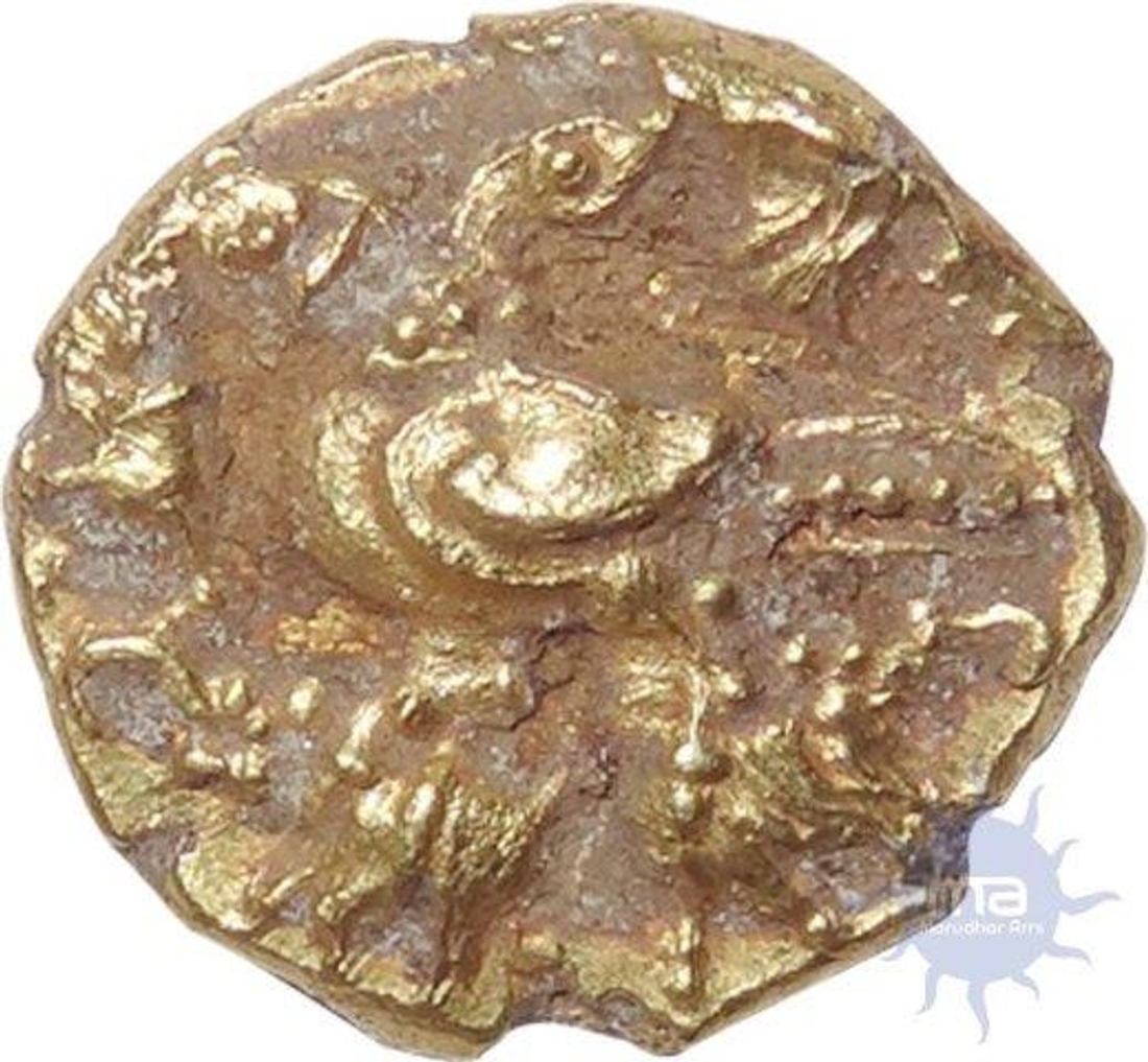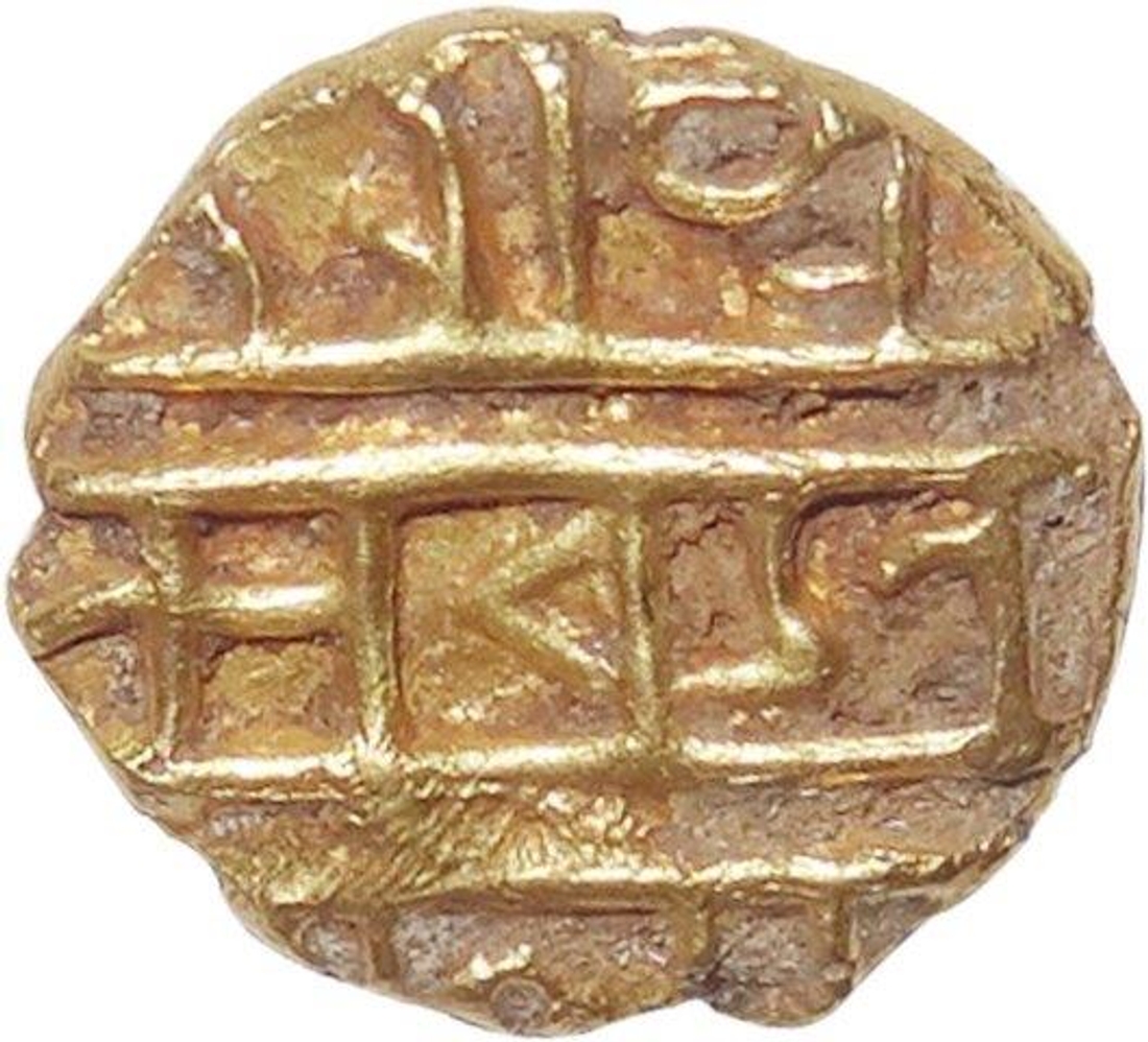 | Full Description: Vijayanagara Empire, Achutharaya (1529-1542AD), Gold 1/2 Varaha, Obv: Gandaberunda moving to left profile of the bird is presented the bird is carrying in each of its two beaks and two claws a bull fully grown tusker elephant, Rev: Three line nagari legend with interlinear rules Sri pra / tapachyuta / raya, 1.7gm, 10.1mm, (Girijapathi # 224), about extremely fine, Rare. | ||||