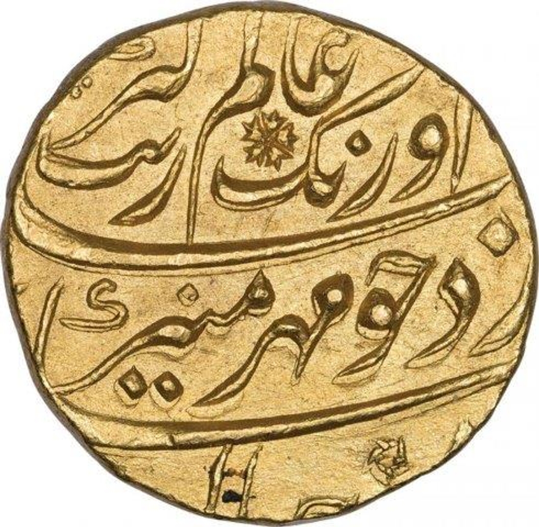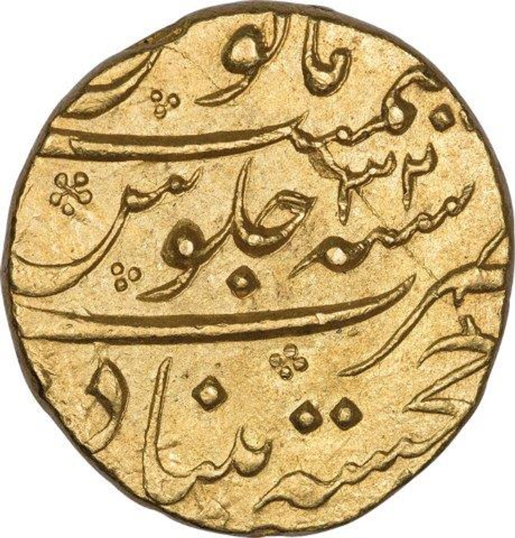 Lot # 177 - Rare Gold Mohur Coin of Aurangzeb of Khujista Bunyad Mint.