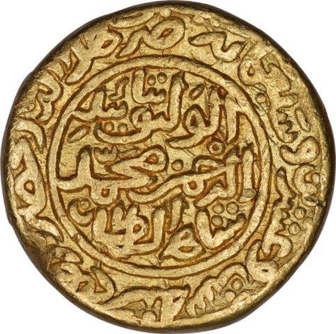 | Full Description: Delhi Sultanate, Muhammad Bin Tughluq, Hadrat Delhi Mint, Gold Dinar, AH 726, Al Mujahid Type, Obv: kalima shahada, Rev: al wathiq bil tayid-ur-rahman in centre around hijri year in word & zarb, 10.67g, 22.02mm, (G&G # D331), about extremely fine, Rare. | ||||