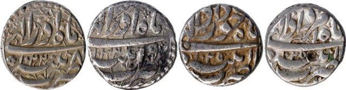 | Full Description: Jahangir, Patna Mint, Silver Rupee(4), AH 1022, 1025, 1032/8,11,19 RY, Lot fo Four Different Months Khurdad, Amardad & Azar(2), Obv: nur ud din jahangir shah akbar shah, Rev: ilahi month, zarb & hijri date, 11.5g, 17.94mm each approx, (KM # 145.12), about very fine to extremely fine. | ||||