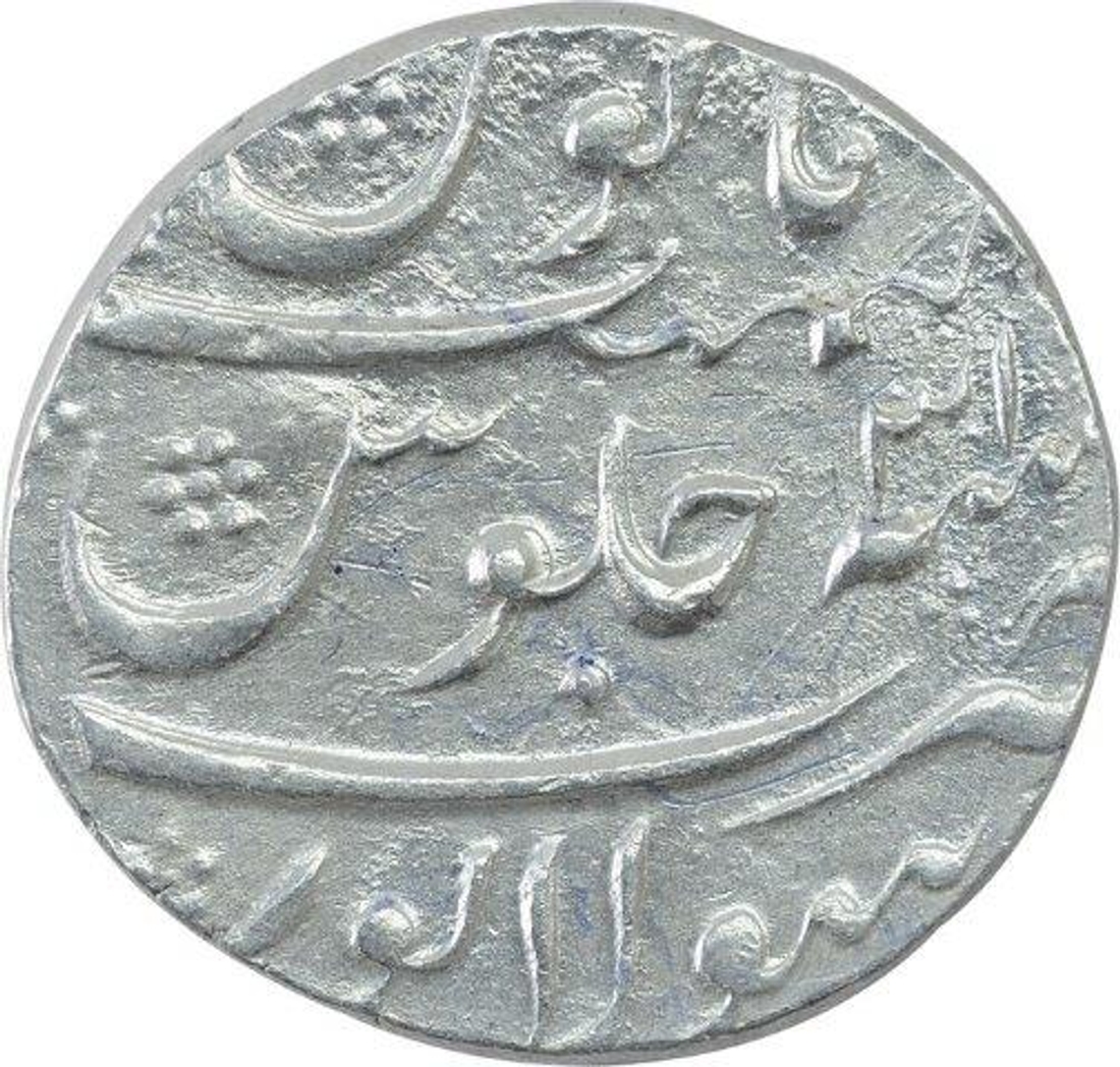 | Full Description: Aurangzeb Alamgir, Sholapur Mint, Silver Rupee, AH 1097/31RY, Obv: "badr munir" couplet, Rev: sana julus zarb at bottom, 11.40g, 25.68mm, (KM # 300.82, Date Unlisted in KM), dotted motifs on both sides, about extremely fine. | ||||