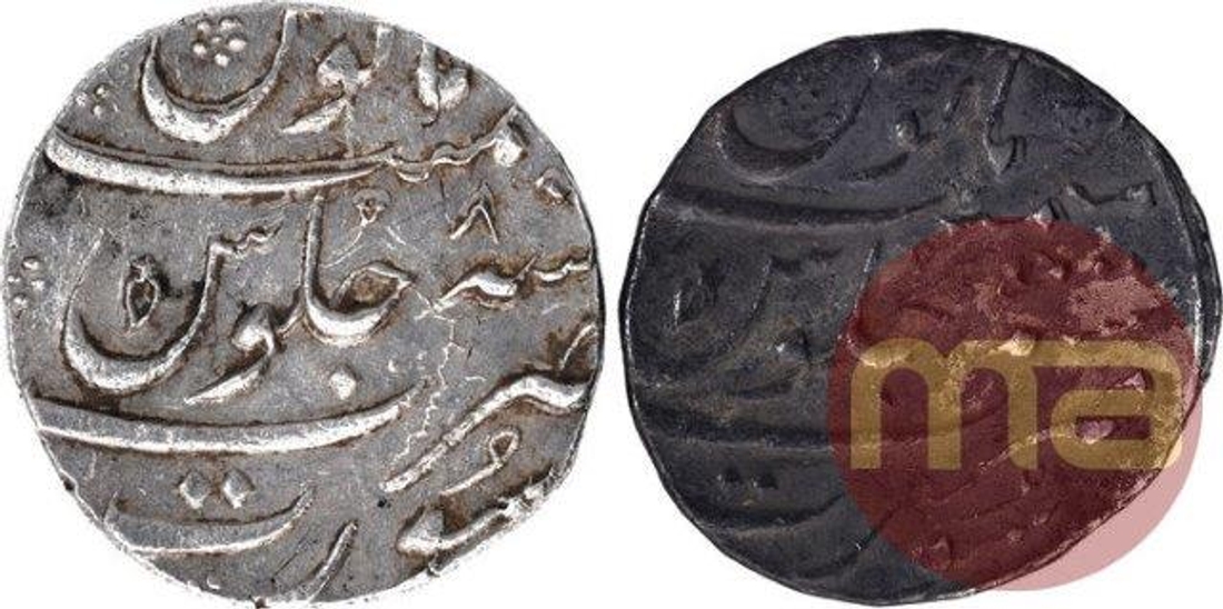 | Full Description: Farrukhsiyar, Surat Mint, Silver Rupee(2), AH X128, XXX1/ 5,8 RY, Broad Flan, Obv: "badshah bahr-o-barr" couplet, Rev: sana julus zarb at bottom, 11.51g, 11.55g, 26.62mm, 26.69mm, (KM # 377.59), about extremely fine. | ||||