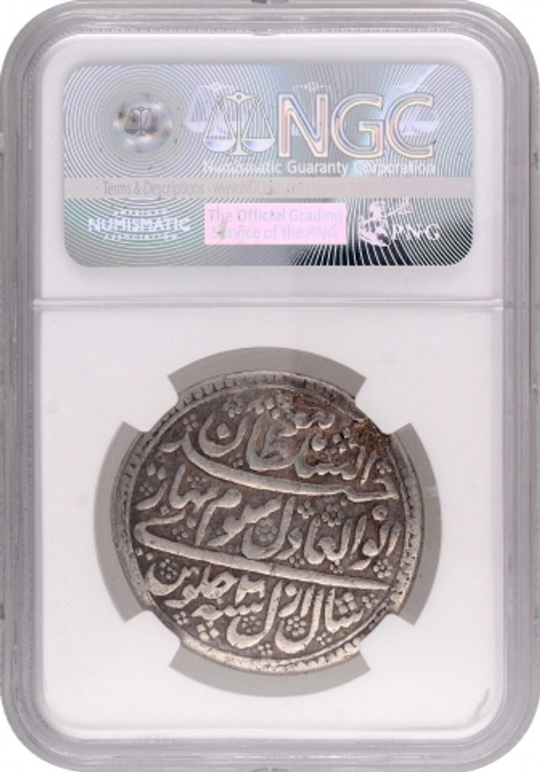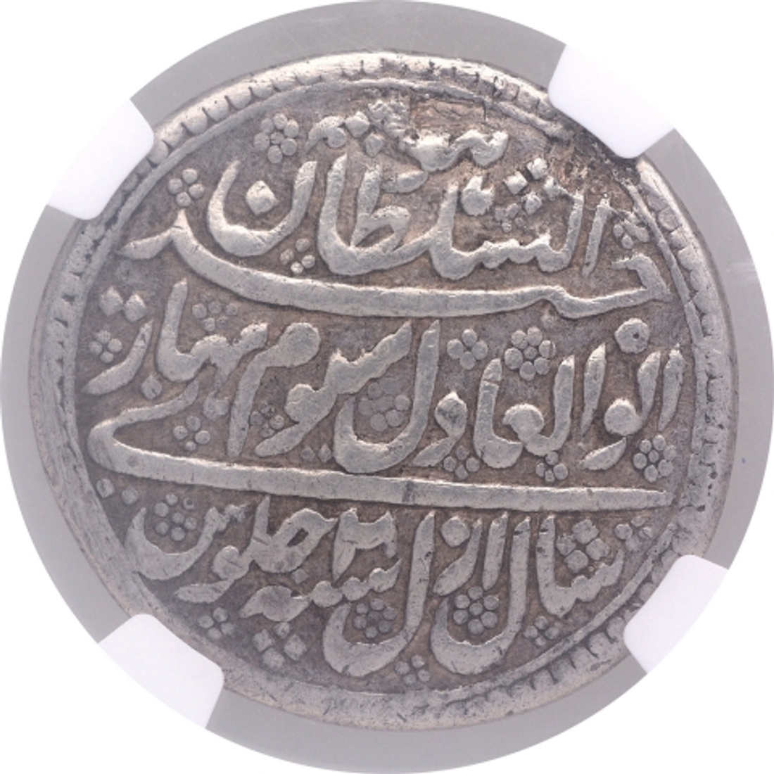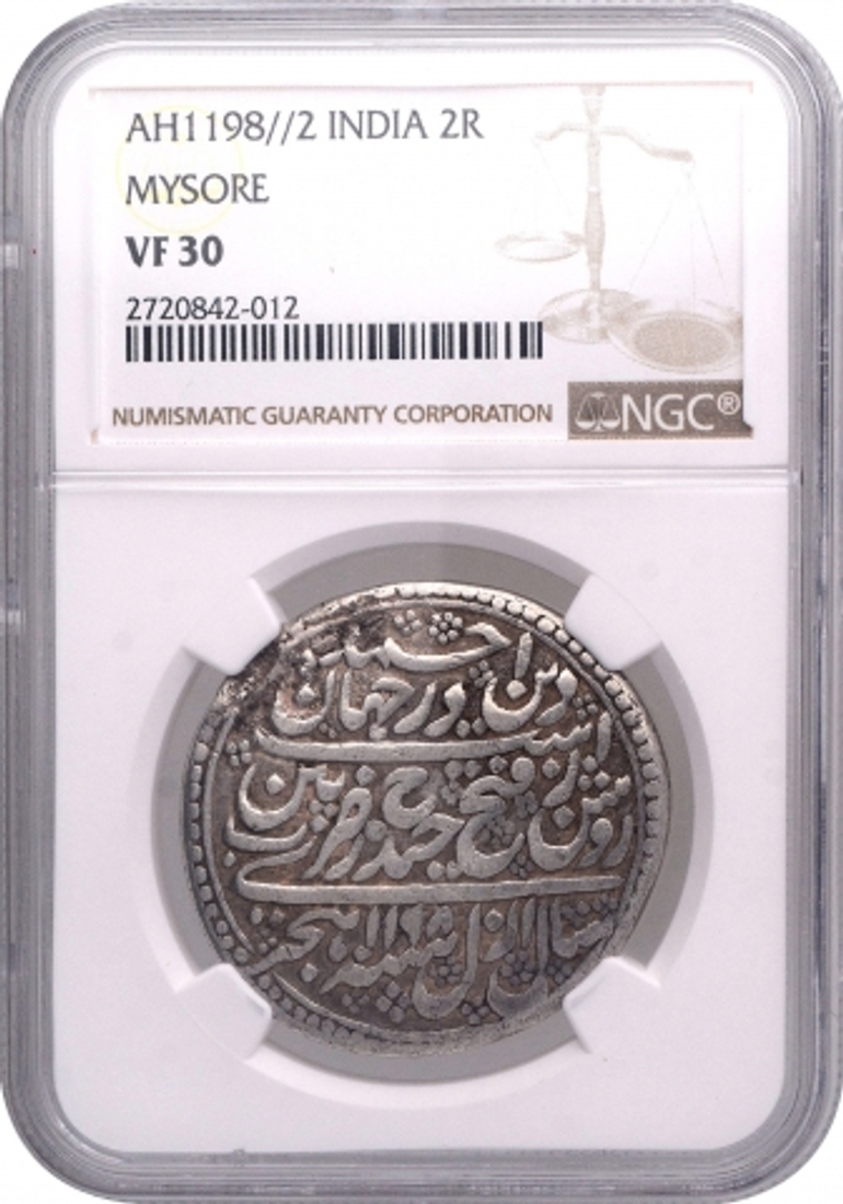 | Full Description: Mysore, Tipu Sultan, Patan (Seringpatan) Mint, Silver Double Rupee (2 Rupee/Haidari), AM 1198/2 RY, Obv: deen-e-ahmad dar jahan ast, roshan ze fatah haidari, zarb patan, saal azal, sana 1198 hijri, Rev: huwas sultan-ul-waheed al adil, suwem bahari, saal azal and sana 2 julus, (KM # 127), traces of ex-mount, graded and slabbed by NGC as VF 30, Very Rare. | ||||