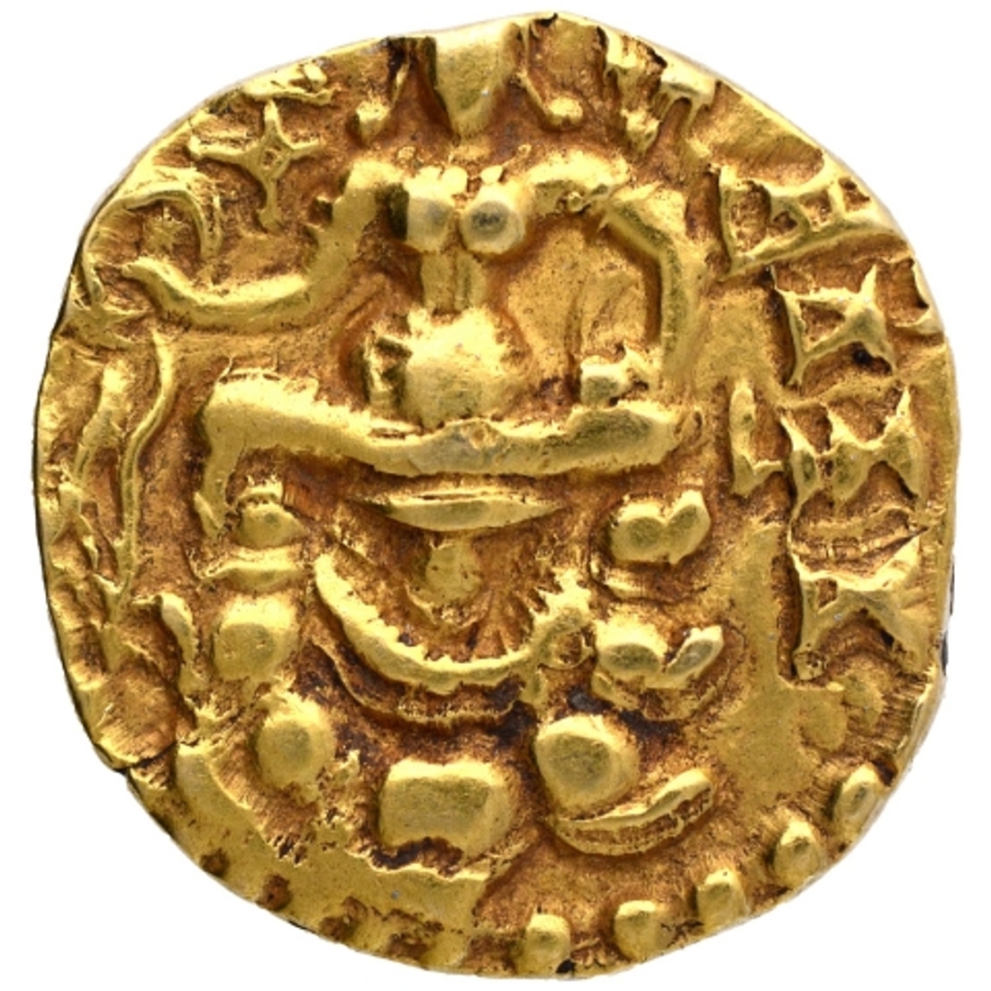 | Full Description: Gupta Dynasty, Chandragupta II (Vikramaditya) (375-415 AD), Gold Dinar, “Archer” type, Obv: King, nimbate, standing facing left, is in salwar and wearing necklace, the king holds a long bow in his left hand and arrow in his right with garuda standard at left, the Brahmi legend “Chandra” is below the king’s arm, Rev: goddess Lakshmi seated on a lotus in padmasana facing front, holding diadem in her right hand while the left is resting on her thigh, a lotus whose stem rises from under her left arm is seen adjacent to the goddess’s face, tamgha to right, Brahmi legend “Sri Vikramah”, 7.7g, 18.32mm, (variant of Altekar, Bayana Hoard # Pl. XI-4/TOTGE, S. Kumar # Class. III-Var. A.5.1), about very fine, Rare. | ||||