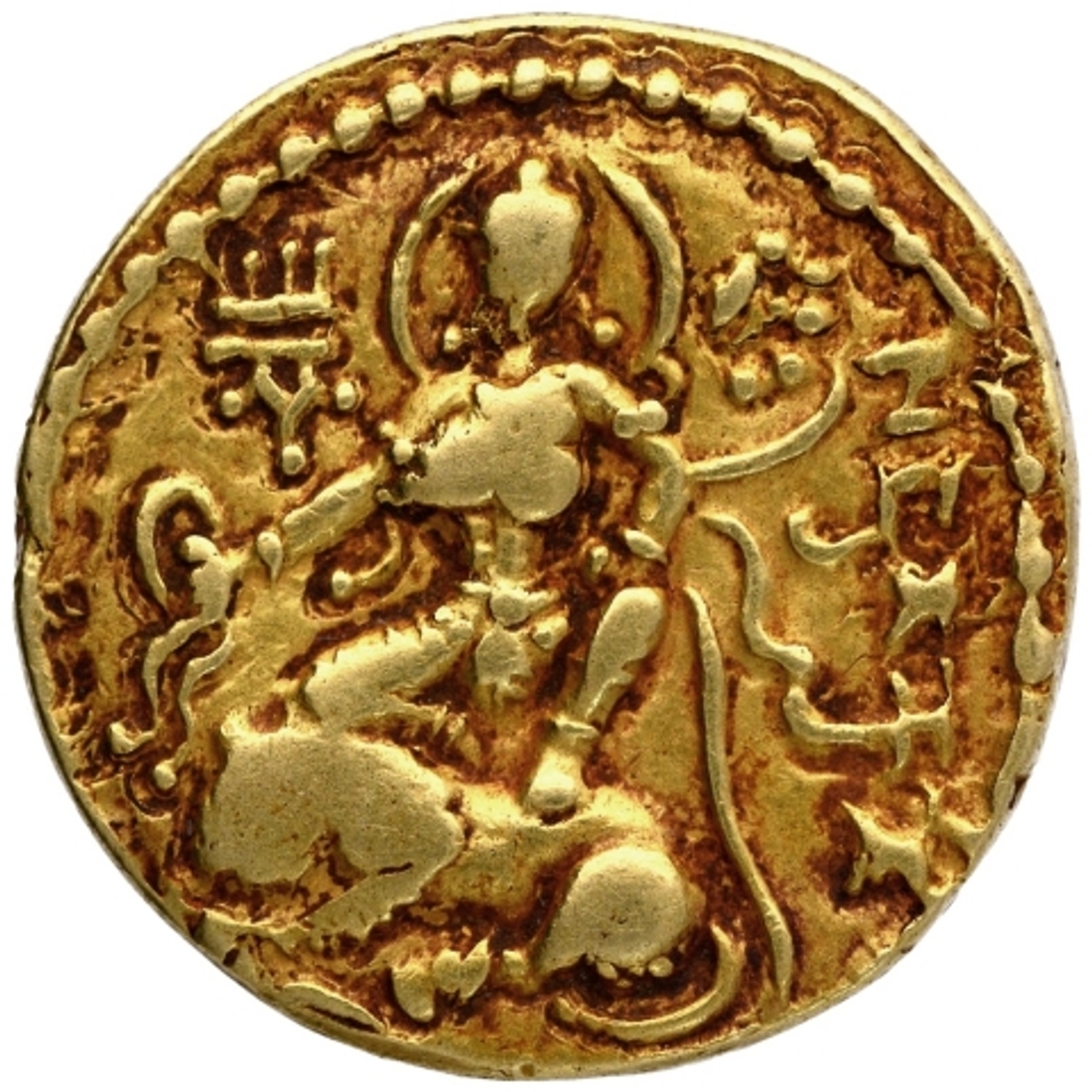 | Full Description: Gupta Dynasty, Chandragupta II (Vikramaditya II) (375-415 AD), Gold Dinar, "Lion Slayer" type, Obv: the king, nimbate, is seen mid-hunt, wearing a dhoti, a cap with a pearl string behind, a necklace and in armour, the king is seen holding bow in the right hand with the left having released the bow string and slaying the Lion and the Lion is seen falling backwards with an arrow in its mouth facing the king, circular Brahmi legend "Narandrachandrah Pra(thitarano rane jayatyajayyo bhuvi Sinha)vikramah”, Rev: nimbate, goddess Ambika-Lakshmi, seen wearing jewelry on her ears, neck, arms, waist and ankles, is seated in Vamardhaparyanka pose on couchant Lion to right, the goddess is seen holding diadem in her right hand with a lotus stalk coiled around her left arm, with an unidentifiable rope hanging from the wrist of the left hand which rests on her thigh, Brahmi legend at right "Simhavikramah", 8.0g, 19.67mm, (variant of Altekar, Bayana Hoard # Pl. XVI-8/TOTGE, S. Kumar # Class III-Var.B.3), about extremely fine, Exceedingly Rare. This beautiful specimen with the figures of the Devi, the King as lion-slayer and the lion itself visible in complete detail, is a testament to the rich and refined artistic capabilities of the Gupta era and lends credence to this period being the Golden Era in the subcontinent’s history. | ||||