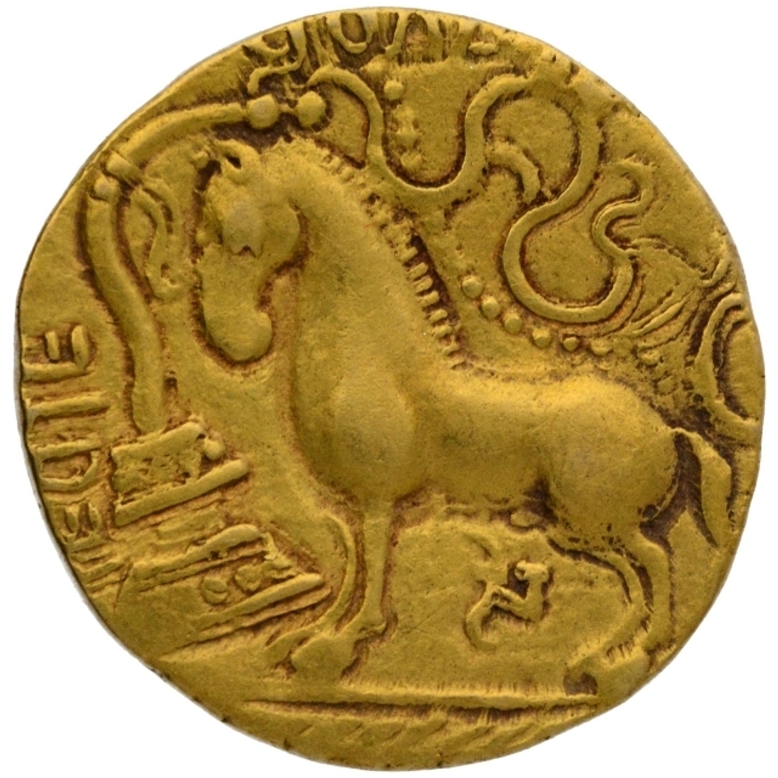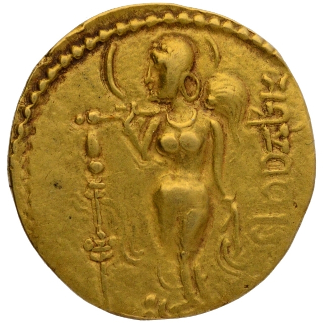 Gupta Empire, Samudragupta (345-375 AD), Gold Dinar, "Ashwamedha" type, Obv: sacrificial Horse standing facing left, Yupa (sacrificial post) in its front, yupa has an ornamental pedestal in two steps, slightly bent in the centre, crescent behind the haunch of the Horse, and string of beads above the head and back, Brahmi legend "Rajadhiraja Prithiva......" (King of Kings, who conquered the earth, Restorer of Ashwamedha), around, Brahmi letter 'Si' (Siddam) on top of a pedestal placed on the platform under the Horse belly, Rev: chief queen in the guise of a goddess, standing left carrying a fly-whisk in her flexed hand, placed on her shoulder and holding towel in left hand, Brahmi legend "Ashwamedha Parakramah" in the right field and ritual needle or Soochi at the left, 7.41g, 20.79mm, (Variant of Altekar, Bayana Hoard # Pl. V-5/TOTGE, S. Kumar # Class I-Var. B1), choice very fine, Extremely Rare. |