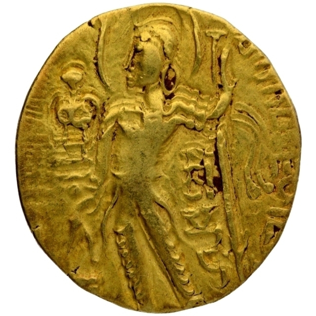 Gupta Dynasty, Samudragupta (335-370 AD), Gold Dinar, “Sceptre/Standard” type, Large flan, Obv: king, nimbate, standing facing left, holding royal sceptre (Rajadhanda) adorned with ribbon in left hand and sacrificing over altar, Garuda standard at left, Brahmi legend “Samudra” below king's arm, circular Brahmi legend around “(Samarasasata) vitatavijayo ji……”, Rev: goddess Lakshmi, nimbate, seated on high backed throne, holding diadem and cornucopia, tamgha to upper left, both feet are resting on a circular mat, two legs of the throne clearly visible and Brahmi legend “Parakramah” in the right field, 7.45g, 20.96mm, (variant of Altekar, Bayana Hoard # Pl. II-10 & 11/TOTGE, S. Kumar # Class II -Var. A.4), about very fine, obverse is partially double struck, Rare. |