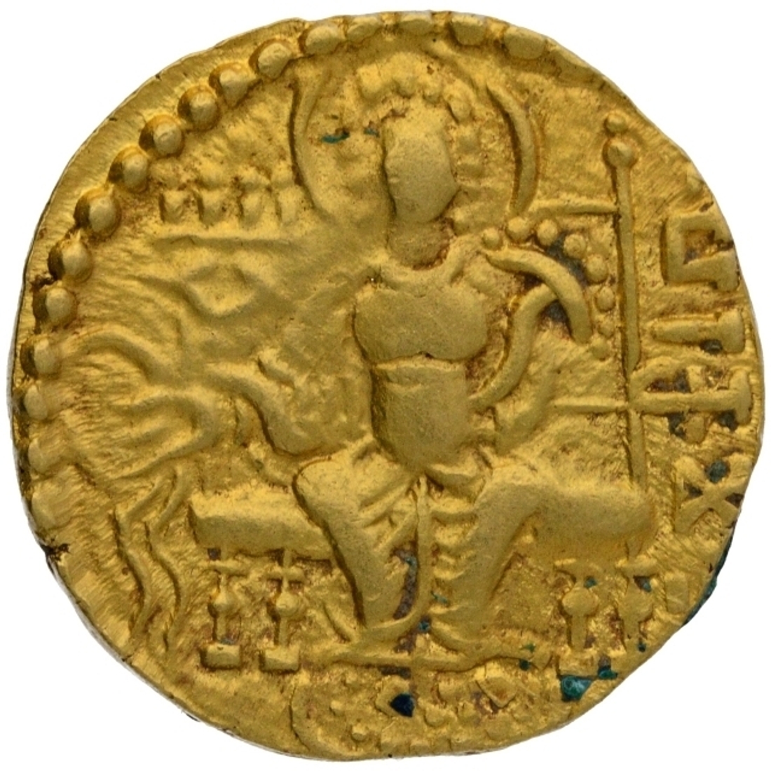 | Full Description: Gupta Dynasty, Samudragupta (335-370 AD), Gold Dinar, “Sceptre/Standard” type, Obv: king, nimbate, standing facing left, holding royal sceptre (Rajadhanda) adorned with ribbon in left hand and sacrificing over altar, Garuda standard at left, Brahmi legend “Samudra” below king's arm, circular Brahmi legend around “Samarasasata......jayo jitaripuraji...”, Rev: goddess Lakshmi, nimbate, seated on high backed throne, holding diadem and cornucopia, tamgha at upper left, both feet are resting on a circular mat, four legs of the throne clearly visible and Brahmi legend “Parakramah” in the right field, 7.64g, 20.41mm, (variant of Altekar, Bayana Hoard # Pl. II-13/TOTGE, S. Kumar # Class II -Var. A), choice extremely fine, Very Rare. | ||||