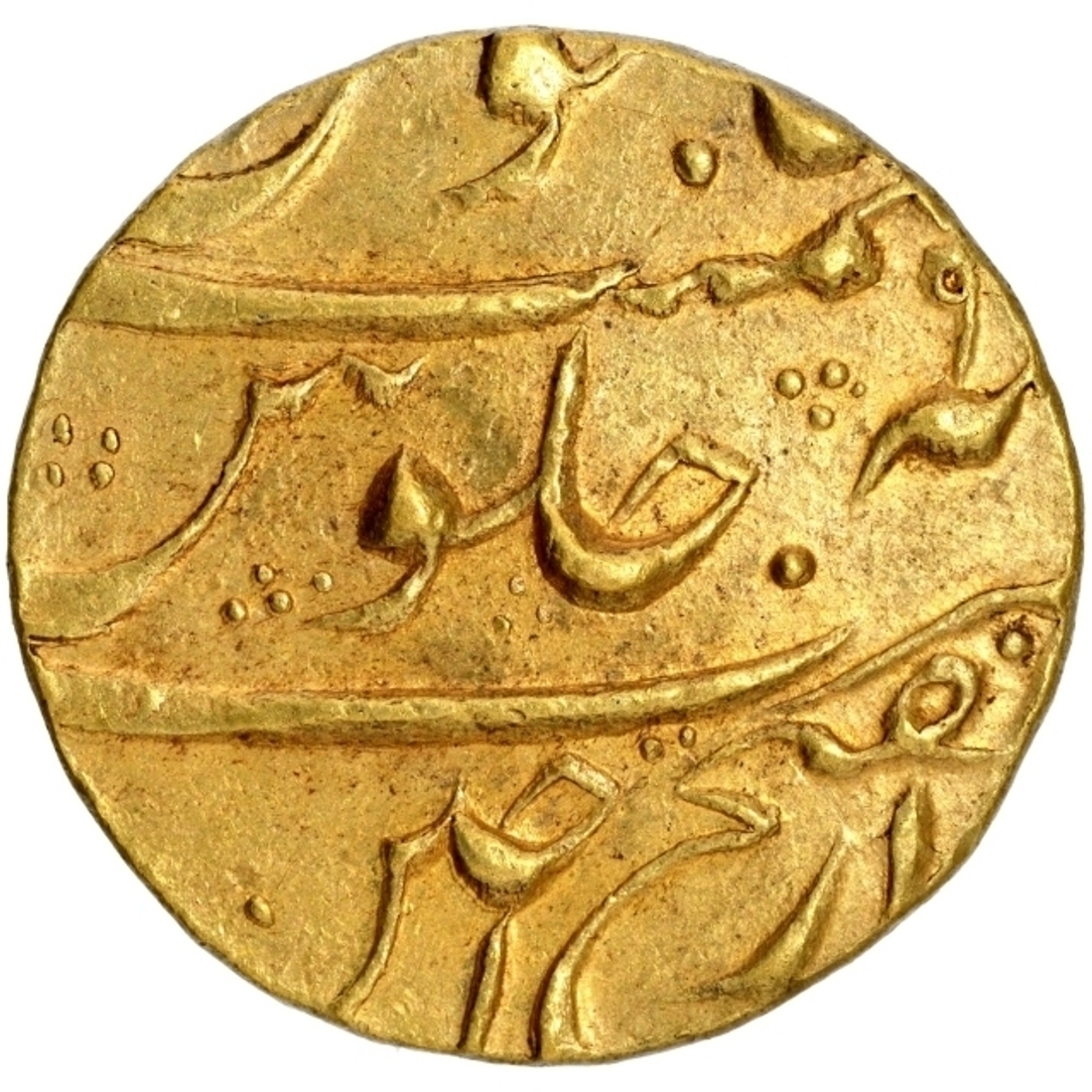 | Full Description: Muhammad Shah, Ujjain Dar ul Fath Mint, Gold Mohur, 9 RY, Obv: Persian legend "Sikka Mubarak Badshah Ghazi Muhammad Shah", Rev: Persian legends "sana 9 julus", zarb Ujjain with epithet "Dar ul Fath" at the bottom, 10.9g, 23.16mm, (KM # 438.25), sharp stikes, no test marks, almost uncirculated, Rare.