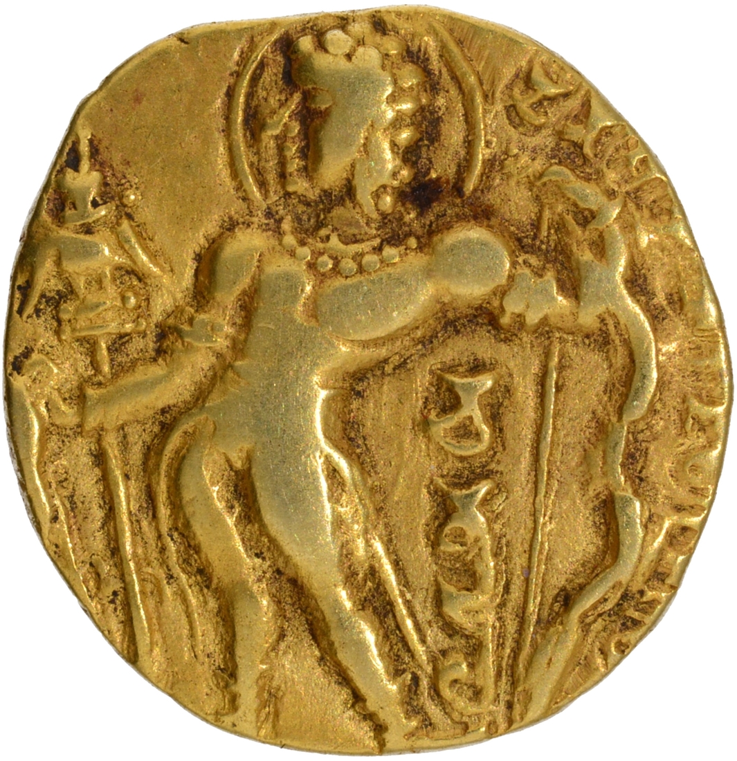 Gupta Dynasty, Chandragupta II (Vikramaditya) (375-415 CE), Gold Dinar, "Archer" type, Obv: the king standing facing left, nimbate, holding a longbow in his left hand and an arrow in his right, a Garuda standard in the left field, the Brahmi legend “Chandra" below the king's arm, the Brahmi legend “Deva Shri maharajadhiraja (Shri Chandragupta)” around the field, Rev: the goddess Lakshmi, nimbate, facing forward and seated in the padmasana posture on a lotus, holding a diadem in her right hand and a lotus in her left hand, whose stem is coming from inside the hand resting on her thigh, a tamgha in the left field, the Brahmi legend "Sri Vikramah" in the right field, a dotted border around the field, 7.7g, 19.71mm, (Altekar. Bayana Hoard # Pl. IX- 13/TGE, S. Kumar # Class. III-A.5.1), choice extremely fine, Rare.