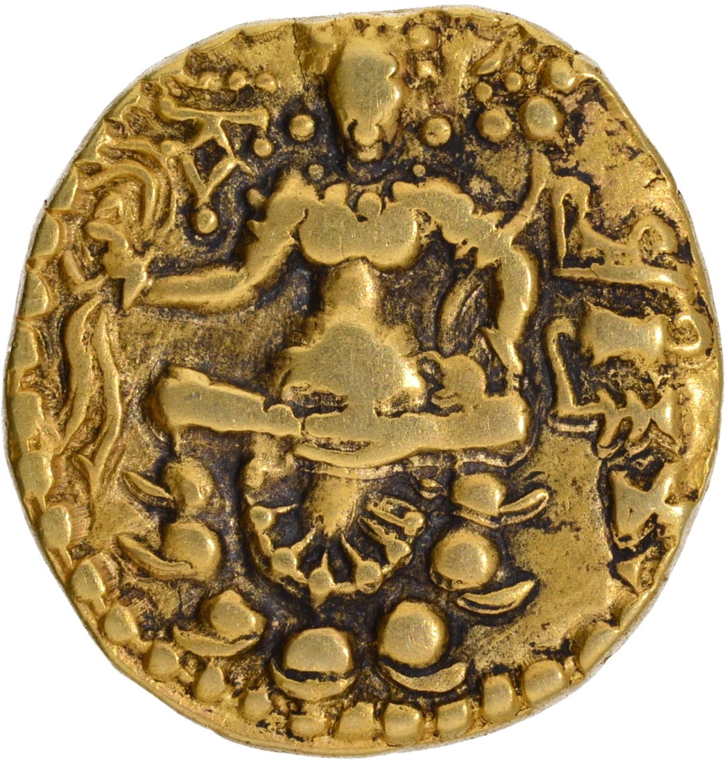 Gupta Dynasty, Chandragupta II (Vikramaditya) (375-415 CE), Gold Dinar, "Archer" type, Obv: the king standing facing left, nimbate, holding a longbow in his left hand and an arrow in his right, a Garuda standard in the left field, the Brahmi legend “Chandra" below the king's arm, the Brahmi legend “Deva Shri maharajadhiraja (Shri Chandragupta)” around the field, Rev: the goddess Lakshmi, nimbate, facing forward and seated in the padmasana posture on a lotus, holding a diadem in her right hand and a lotus in her left hand, whose stem is coming from inside the hand resting on her thigh, a tamgha in the left field, the Brahmi legend "Sri Vikramah" in the right field, a dotted border around the field, 7.7g, 19.71mm, (Altekar. Bayana Hoard # Pl. IX- 13/TGE, S. Kumar # Class. III-A.5.1), choice extremely fine, Rare.