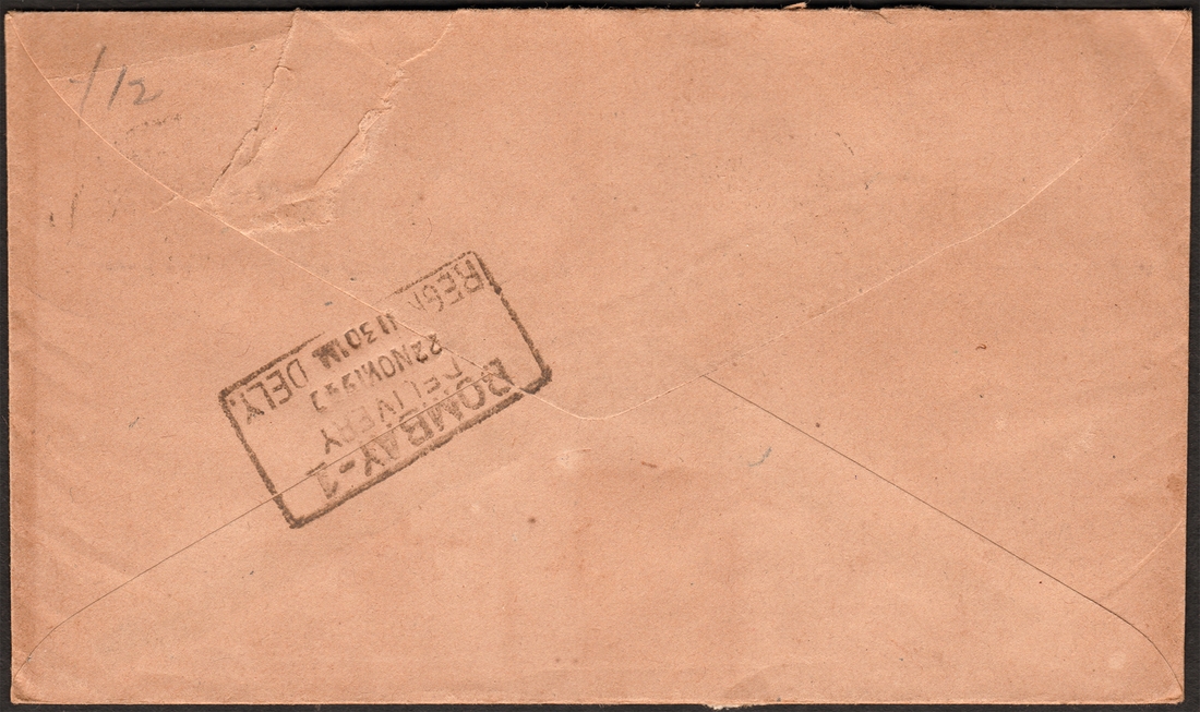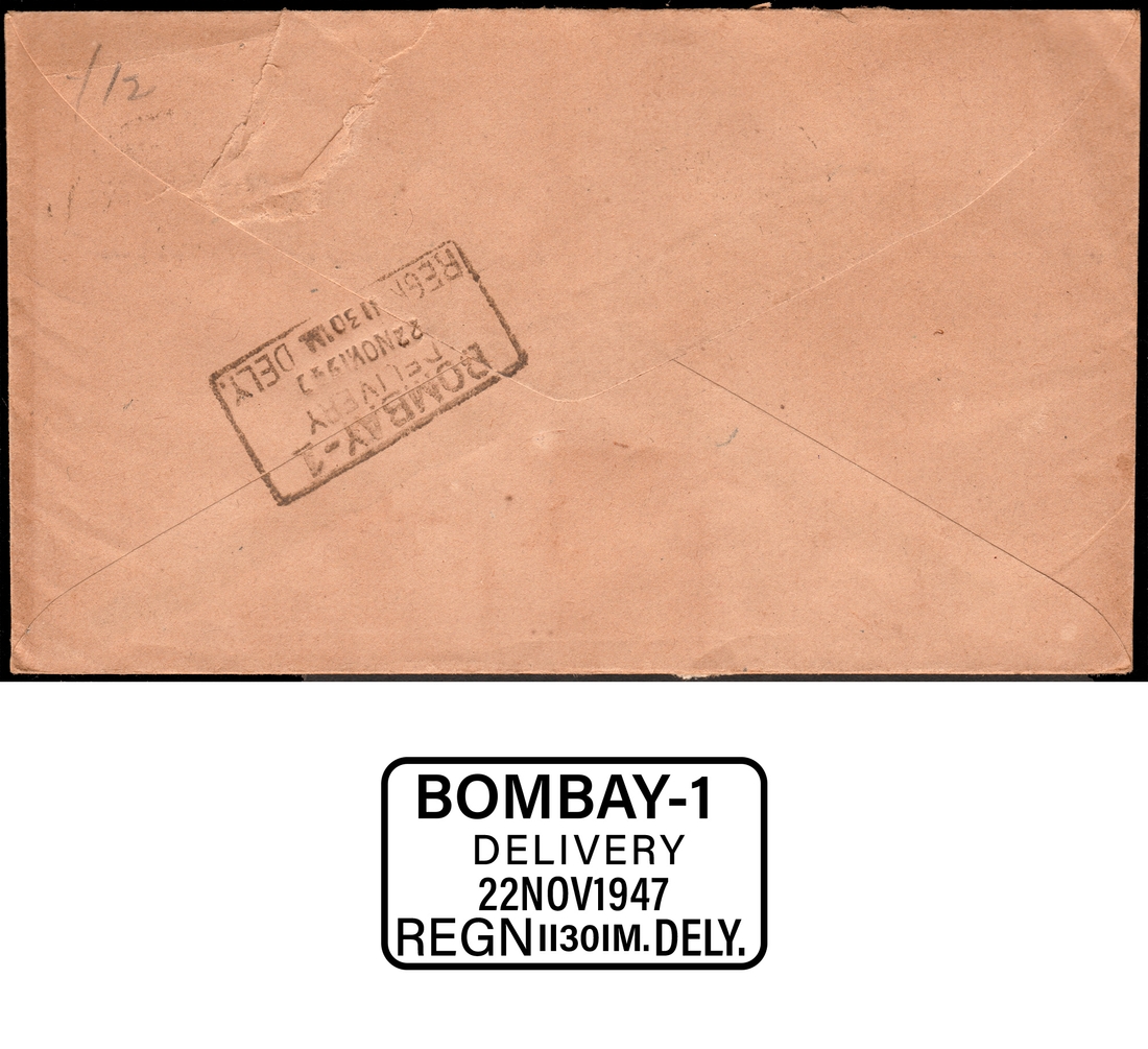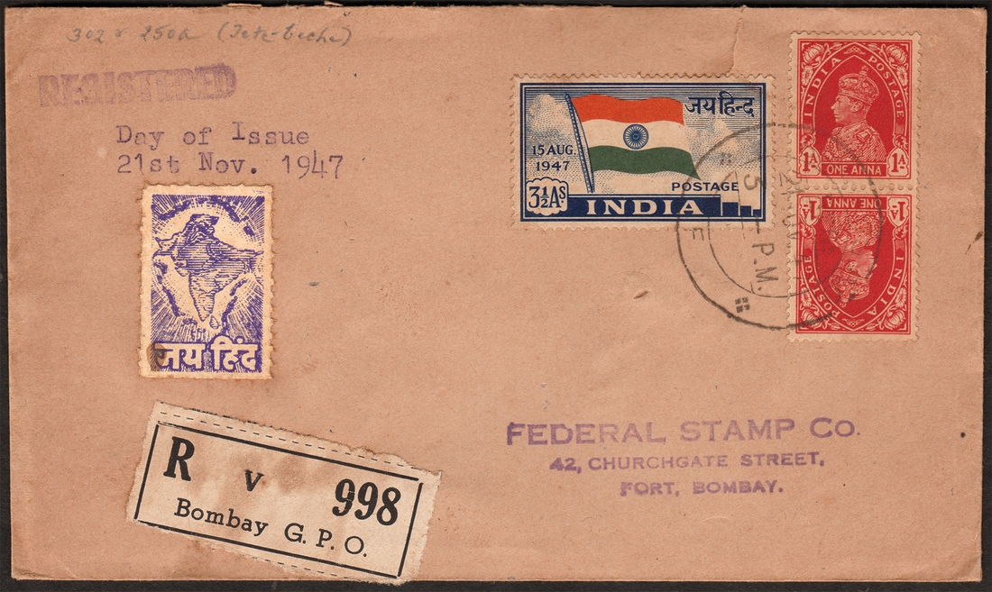 Full Description: Private First Day & Registered Cover, 1947, 3 ½ Annas, Indian Flag, 1 Anna. Tete-beche Pair of George VI, private sticker of Jai Hind undivided Indian Map affixed, FDC endorsed by typing “Day of Issue | 21st Nov. 1947”. The Cover is used as a registered letter with a Registered label affixed that reads as “R v 998 | Bombay G. P. O.” along with a rubber seal of “REGISTERED”, a rectangular delivery seal on reverse “BOMBAY-1 | DELIVERY | 22NOV1947 | REGN 1130 AM. DELY.” good condition. |