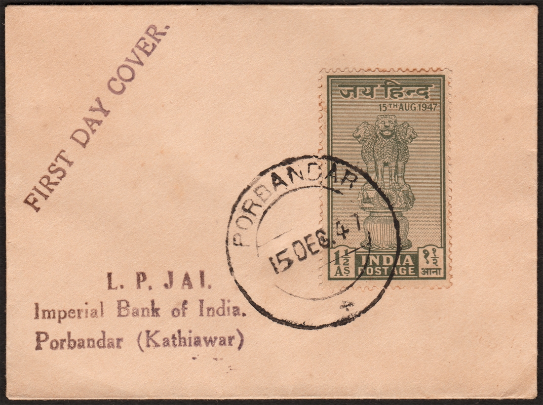| Full Description: Private Cover, First Day Cover, 1947, 1 ½ Annas., Ashokan Pillar Stamp of India’s 1st Definitive series, dispatch cancellation in round seal “PORBANDAR | 15 DEC. 47”, “FIRST DAY COVER” seal, “L. P. JAI. | Imperial Bank of India. | Porbandar (Kathiawar)” printed on the front, small appealing size cover of 9.7 x 7.5 cm, excellent condition, Very Rare as small sized FDC. | ||||