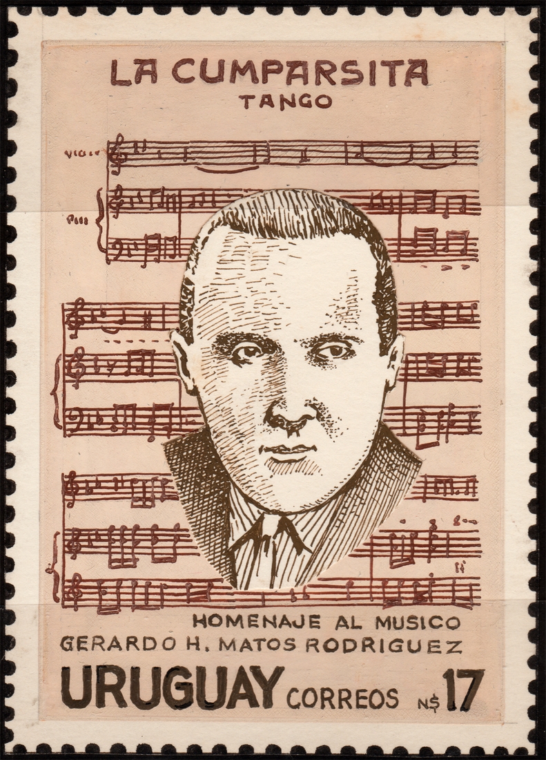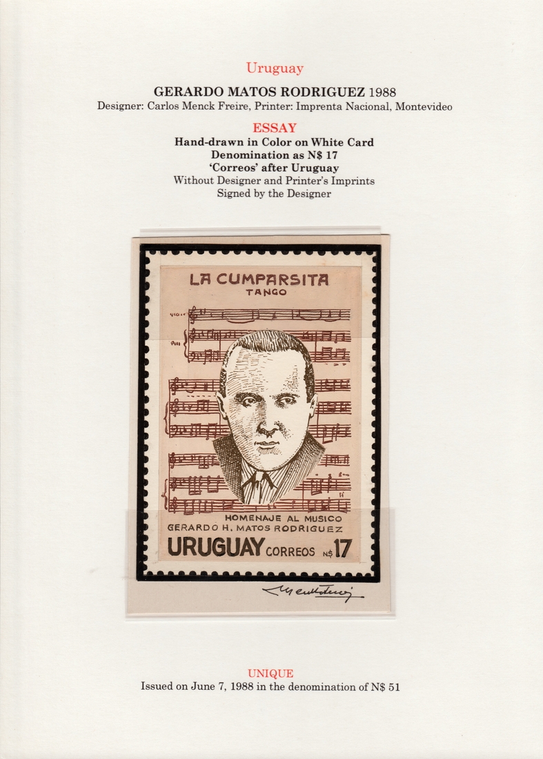 Full Description: Essay, Unadopted & Unissued Stamp design, Uruguay, 1988, Gerardo Matos Rodriguez theme, cut out of Rodriguez pasted on hand drawn design card, stamp design is inscribed as “LA CUMPARSITA | TANGO”, “MOMENAJE AL MUSICO | GERARDO MATOS RODRIGUEZ” & “URUGUAY CORREOS”, stamp designed by Mr. Carlos Menck Freire of value N$17. The design is mounted on a card with an autograph of the designer, design size 95mm x 135mm, excellent condition, Very Rare. |
