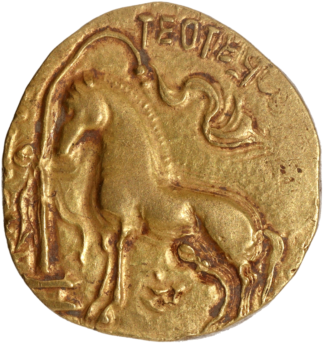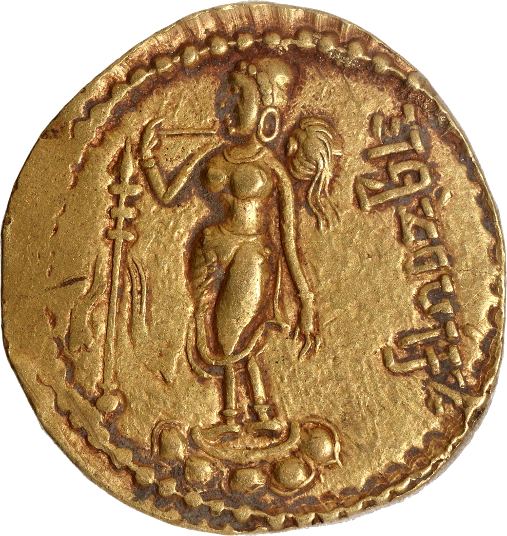 | Full Description: Gupta Empire, Samudragupta (345-375 CE), Gold Dinar, "Ashvamedha" type, Obv: a sacrificial horse standing facing left on a platform, behind a sacrificial post (Yupa), which is shown as an elaborate stand with streamers, ribbons flying in the wind; the Yupa has an ornamental pedestal with two steps which are slightly bent in towards the center, Brahmi letter 'Si' (Siddam) between the horse legs, Brahmi legend "Rajadhiraja pri(thivimavitva divam jayatyahruta vajimedha)" around the field, Rev: the chief queen in the guise of a goddess standing left on a five-petaled lotus-shaped pedestal, carrying a fly-whisk (Chauri) in her right hand, which is placed on her shoulder, Brahmi legend "Ashvamedha Parakramah" on the right field and a ritual needle (Soochi/ceremonial spear with ribbons) on the left field, beaded border around the field, 7.9g, 21.92mm, (Unlisted), sharply struck, superb quality, about extremely fine, Extremely Rare. Note: The Ashvamedha was one of the grandest of the Vedic religious ceremonies of ancient India, and was performed by a king to celebrate or, to be more precise, affirm their imperial sovereignty. The ceremony is described in detail in various Vedic writings, particularly the Shatapatha Brahmana. This coin presents a fascinating addition to the Ashwamedha series of Samudragupta. The reverse showcases the chief queen embodying a goddess, holding a fly-whisk or Chauri in her right hand. Notably, the Chauri's handle stops within her palm, a departure from the conventional depiction where it extends beyond the palm and forms a dot above the Soochi, this type lacks that feature. Additionally, this coin presents a stylized depiction of the queen, standing gracefully in imperial attire, embellished with jewels on her head, neck, and an anklet on her legs. On the obverse, the coin stands out from others due to the noticeable absence of a crescent near the ribbon. | ||||