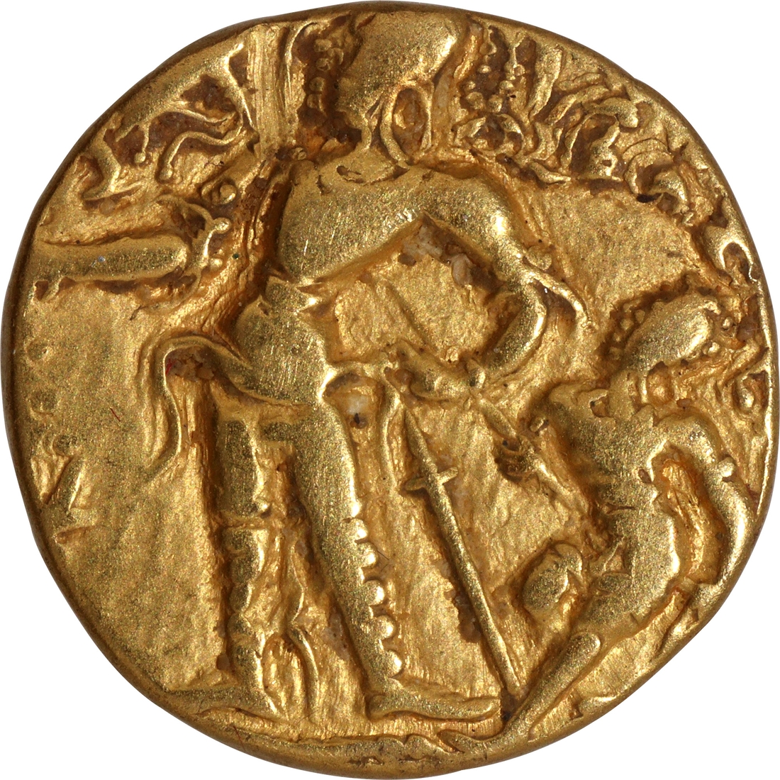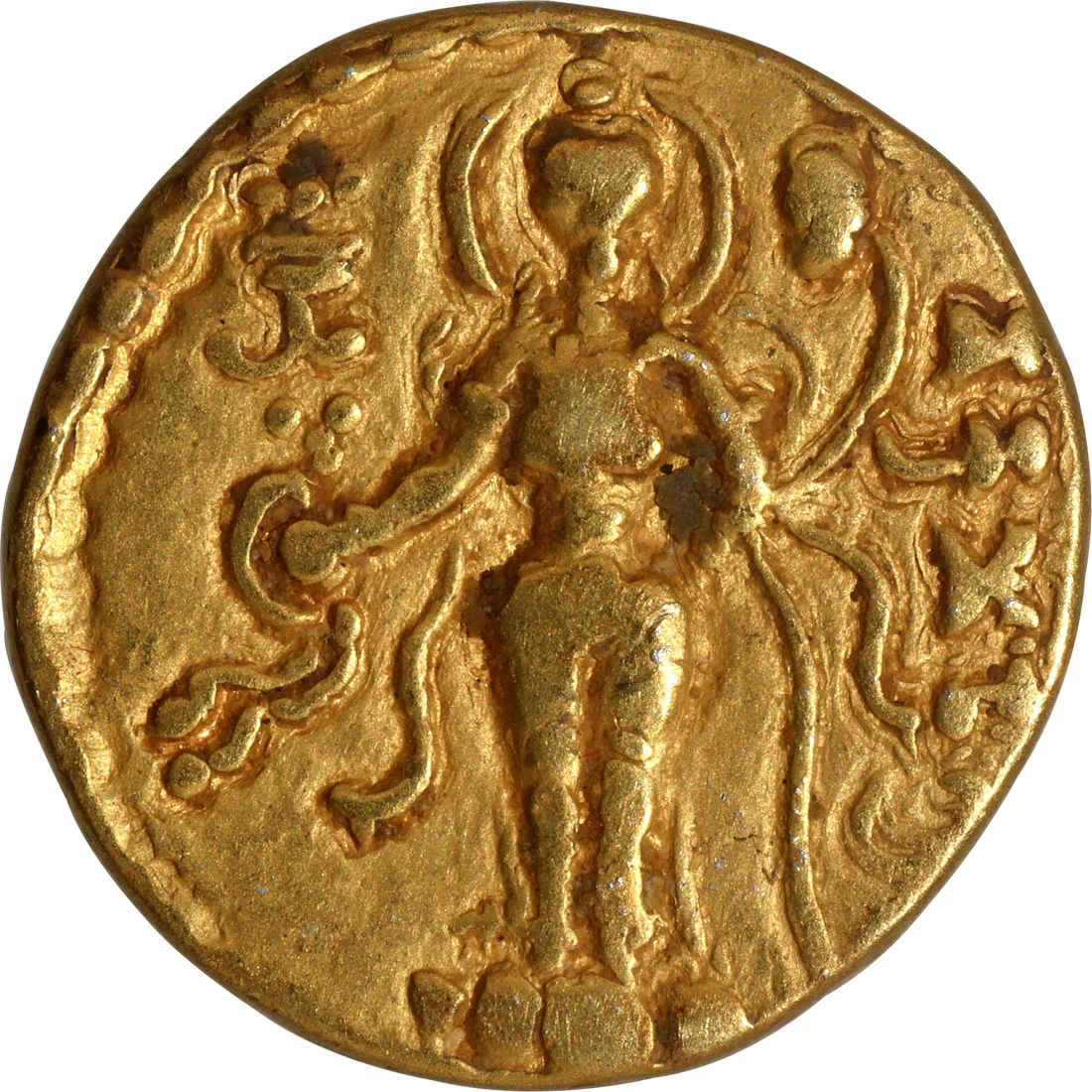 | Full Description: Gupta Dynasty, Chandragupta II alias Vikramaditya (375-415 CE), Gold Dinar, "Chhatra (Parasol)" type, Broad Flan, Obv: the king standing facing left, nimbate, wearing Kushan style clothing, a cap with pearl string, with his fist on the hilt of the sword he carries in his left hand and sacrificing over an altar on the left field, an attendant stands behind him and holding the Chhatra (royal parasol), the attendant has right leg bent up, Brahmi legend “Kshitimvijitya (sucharitairdivam jayati Vikramadityah”) around the field, Rev: the goddess Lakshmi facing to the front, nimbate, standing on a wide lotus-shaped pedestal, holding a diadem in her right hand and a long-stemmed lotus in her left hand, a tamgha on the top left field, Brahmi legend "Vikramadityah" on the right field, dotted border around the field, 7.75g, 20.09mm, (Unlisted in Altekar/TGE, S. Kumar # Class-I, Var. A.1), choice quality, about extremely fine, Extremely Rare. Note: It is a notable Class II Variety C type as per S. Kumar’s Gupta Catalogue. The Chhatra-type coins were innovations of Chandragupta II. This type was introduced probably with the idea of emphasizing his Imperial status as the sole sovereign ruler (eka-chhatratva) in the country. | ||||