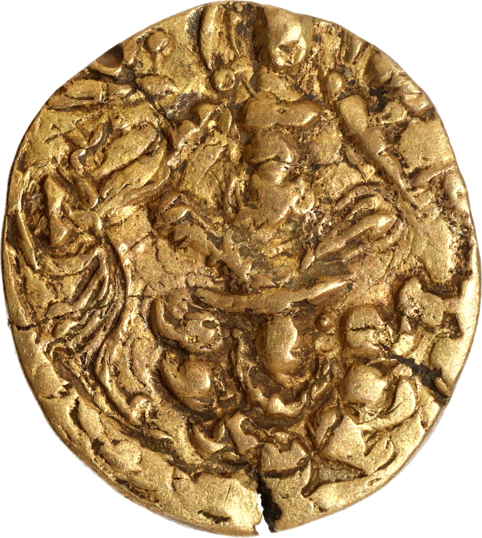 | Full Description: Gupta Dynasty, Chandragupta II alias Vikramaditya (375-415 CE), Gold Dinar, "Archer" type, Obv: the king standing, nimbate, facing left, holding a longbow in his left hand and an arrow in his right, a ribboned Garuda standard on the left field, Brahmi legend “Chandra" below the king's arm, Rev: the goddess Lakshmi, nimbate, facing forward and seated in the padmasana posture on a seven-petaled lotus, holding a diadem in her right hand and a lotus in her left, a tamgha in the left field, the Brahmi legend "Sri Vikramah" in the right field, 8.0g, 19.09mm, (Altekar. Bayana Hoard # Pl. IX-6/TGE, S. Kumar # Class. 3-A.6.1), about very fine, Very Rare. | ||||